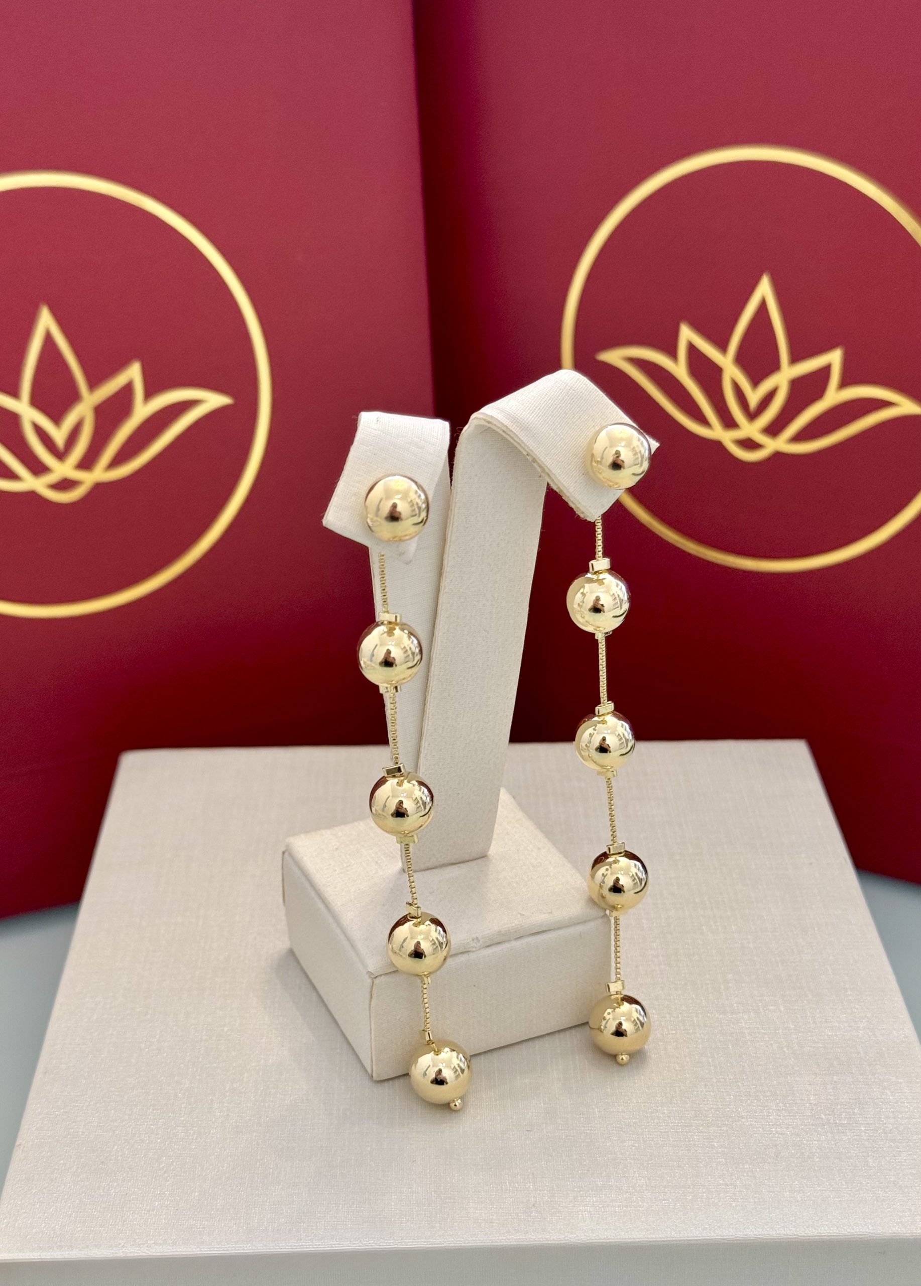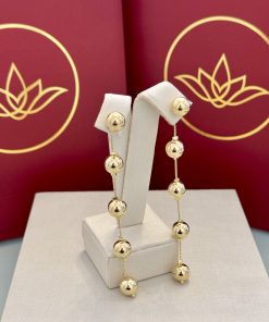 Brinco dois em um em tom dourado, composto por bolas lisas e polidas distribuídas ao longo da haste, criando um visual marcante e cheio de movimento. O acabamento espelhado realça o brilho do dourado e traz presença ao look, sendo uma peça que possui a tarraxa com fio bolinhas ideal para quem busca destaque com linhas limpas e design atual.