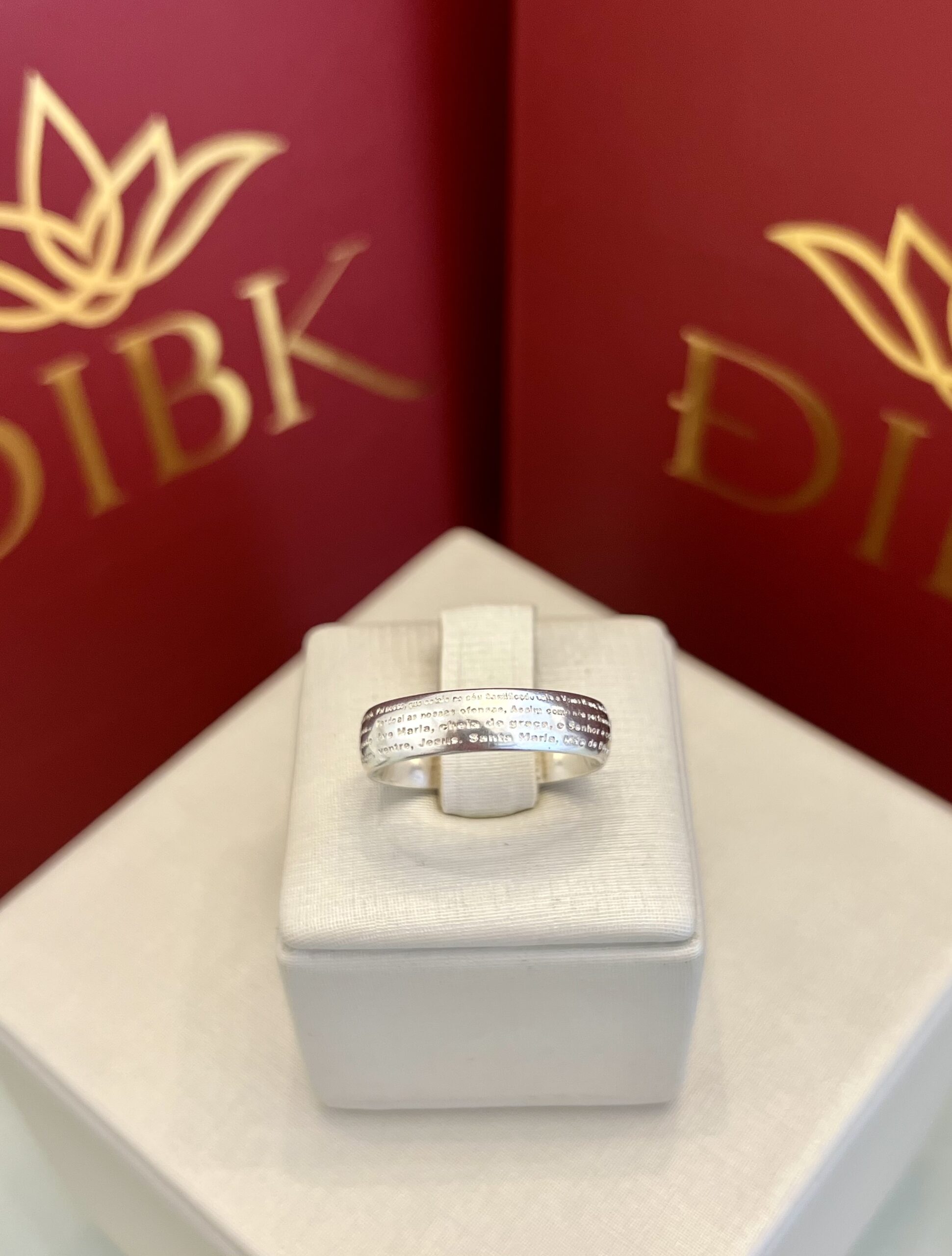 Este elegante anel de prata apresenta um design único, com a oração da Ave Maria delicadamente gravada ao longo do aro. Uma joia que expressa fé e devoção com sutileza e beleza.