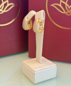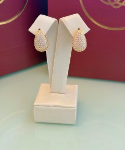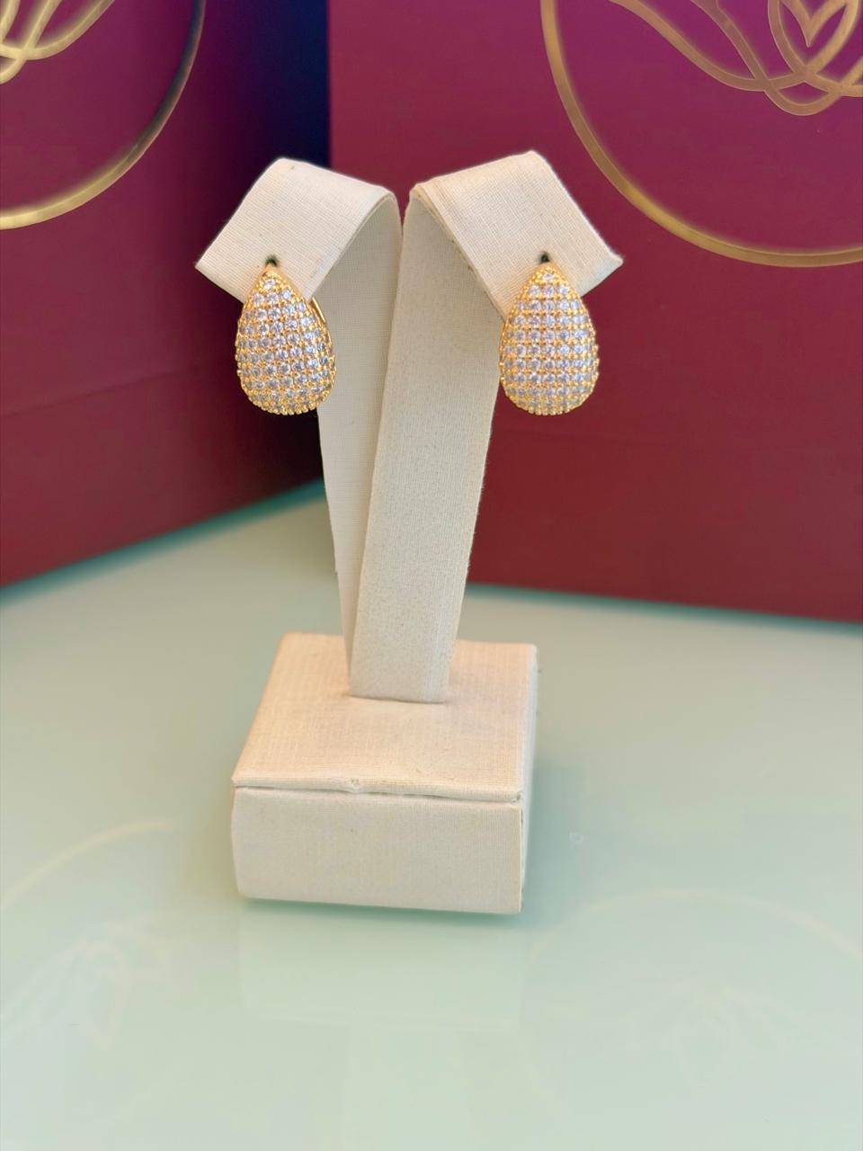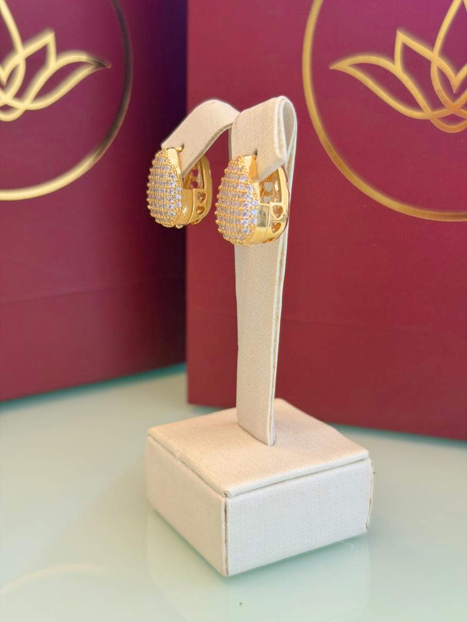 Uma argola moderna com detalhe de gota cravejada em cristais transparentes, criando um brilho que acompanha o movimento com elegância. O banho dourado valoriza o desenho e realça cada pedra, deixando o acessório ainda mais marcante. Uma peça que ilumina o rosto e combina com qualquer composição, do look básico ao mais arrumado.