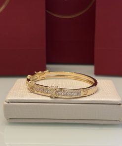 Bracelete modelo Tiffany em tom dourado, com fileira central de zircônias cristal na cor branca que garantem brilho intenso e acabamento delicado. O design é marcado pelos detalhes em formato de “X” ao longo da peça, também cravejados, trazendo identidade e charme ao visual. Um bracelete elegante e atemporal, perfeito para destacar o pulso com luminosidade e presença. Fecho seguro que proporciona praticidade e conforto no uso diário ou em ocasiões especiais.