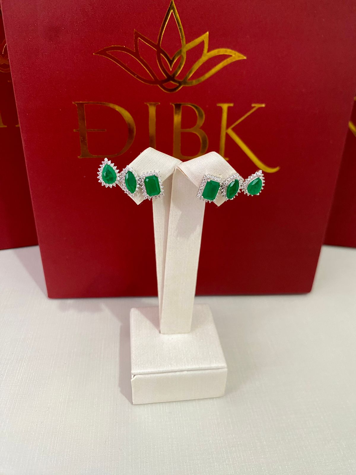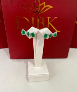 Brinco dois em um com pedras verdes em formato de gota. A peça pode ser usada de duas formas: como um ear cuff com cinco pedras alinhadas ou com um encaixe adicional que adiciona correntes delicadas, proporcionando um efeito alongado e sofisticado.