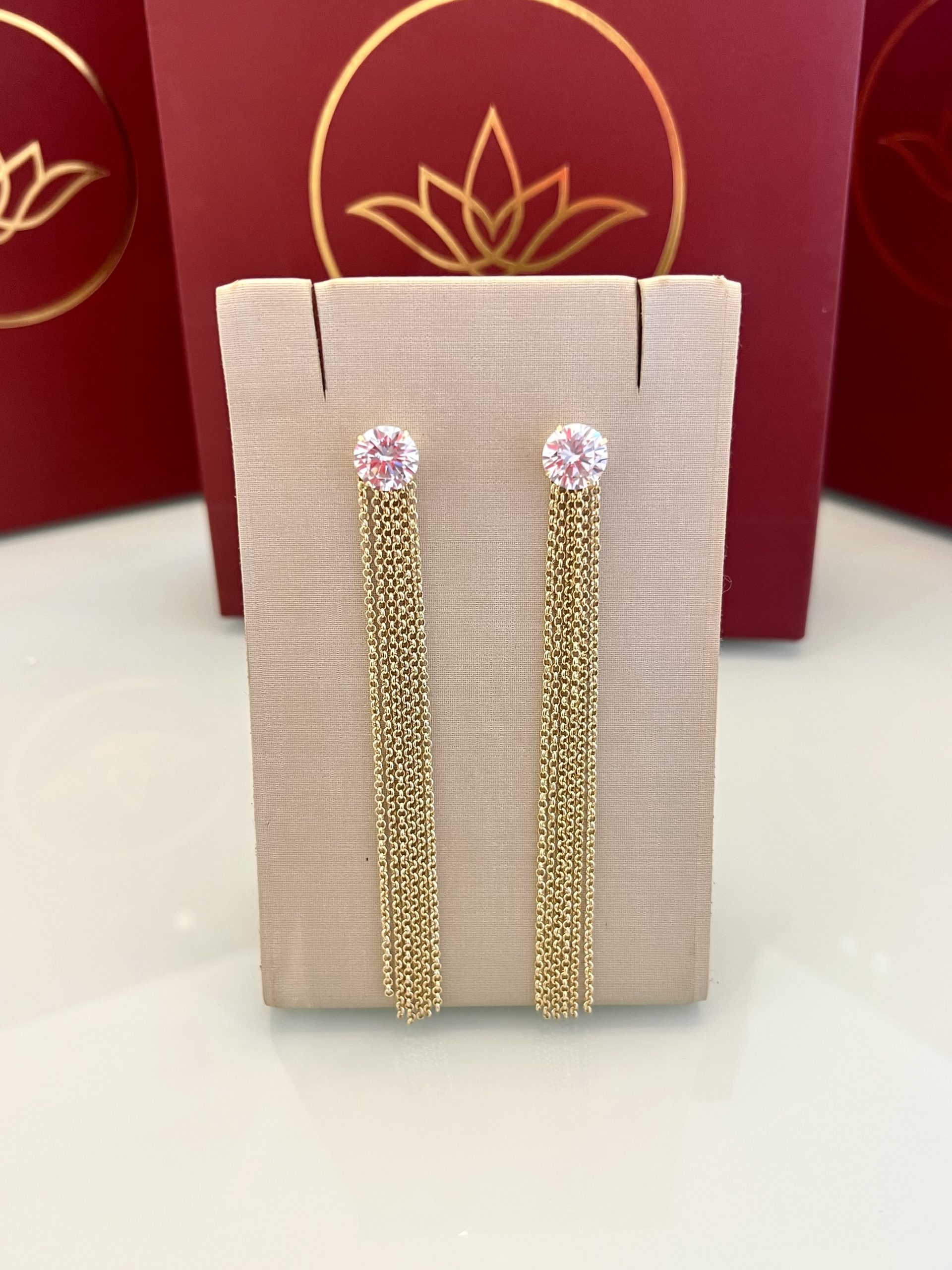 O modelo 2 em 1 de 10MM destaca a pedra rosa com brilho intenso, trazendo um ponto de luz que ilumina imediatamente o visual. A base dourada realça ainda mais a cor da pedra, criando um contraste elegante. A versão de 10MM conta com a franja  mais longa, formando um caimento que entrega movimento e presença. Você pode usar apenas o ponto de luz para um efeito marcante ou adicionar as correntes para transformar o look, criando um visual cheio de luminosidade.