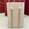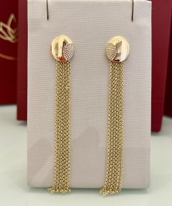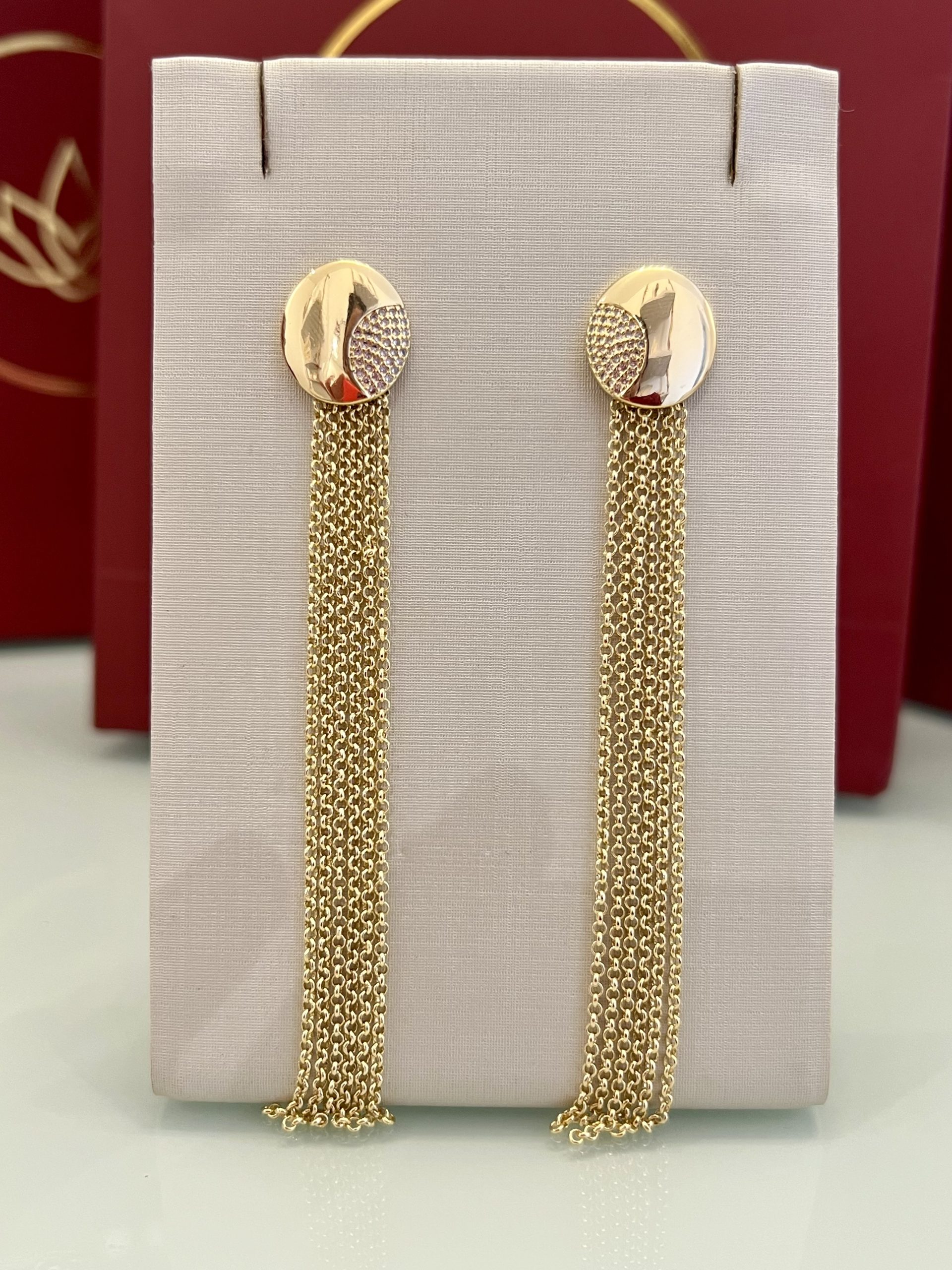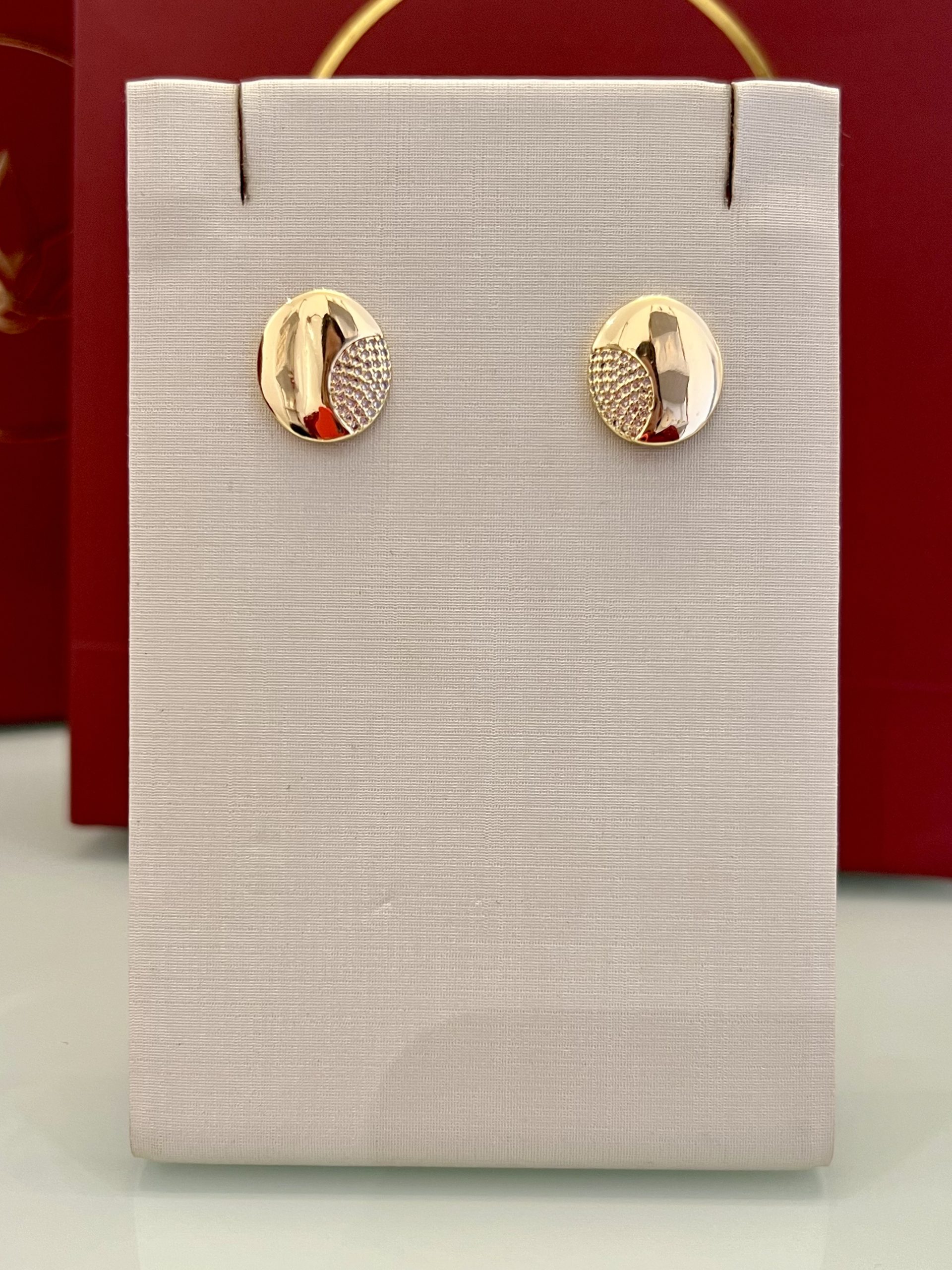 Brinco dourado com base redonda dupla, combinando uma versão lisa e outra cravejada em zircônias cristal, criando um contraste elegante e bem definido. A peça acompanha franja de correntes douradas removível, permitindo diferentes formas de uso. Um modelo funcional, com acabamento cuidadoso e brilho equilibrado.