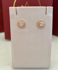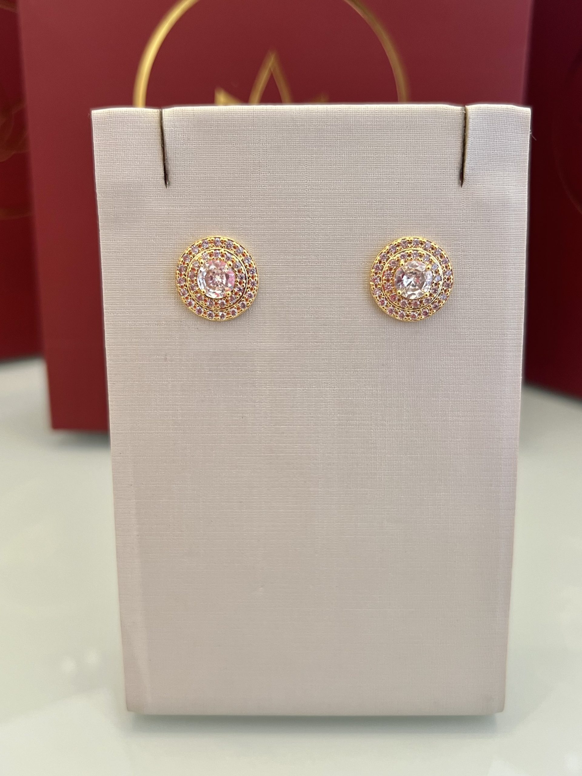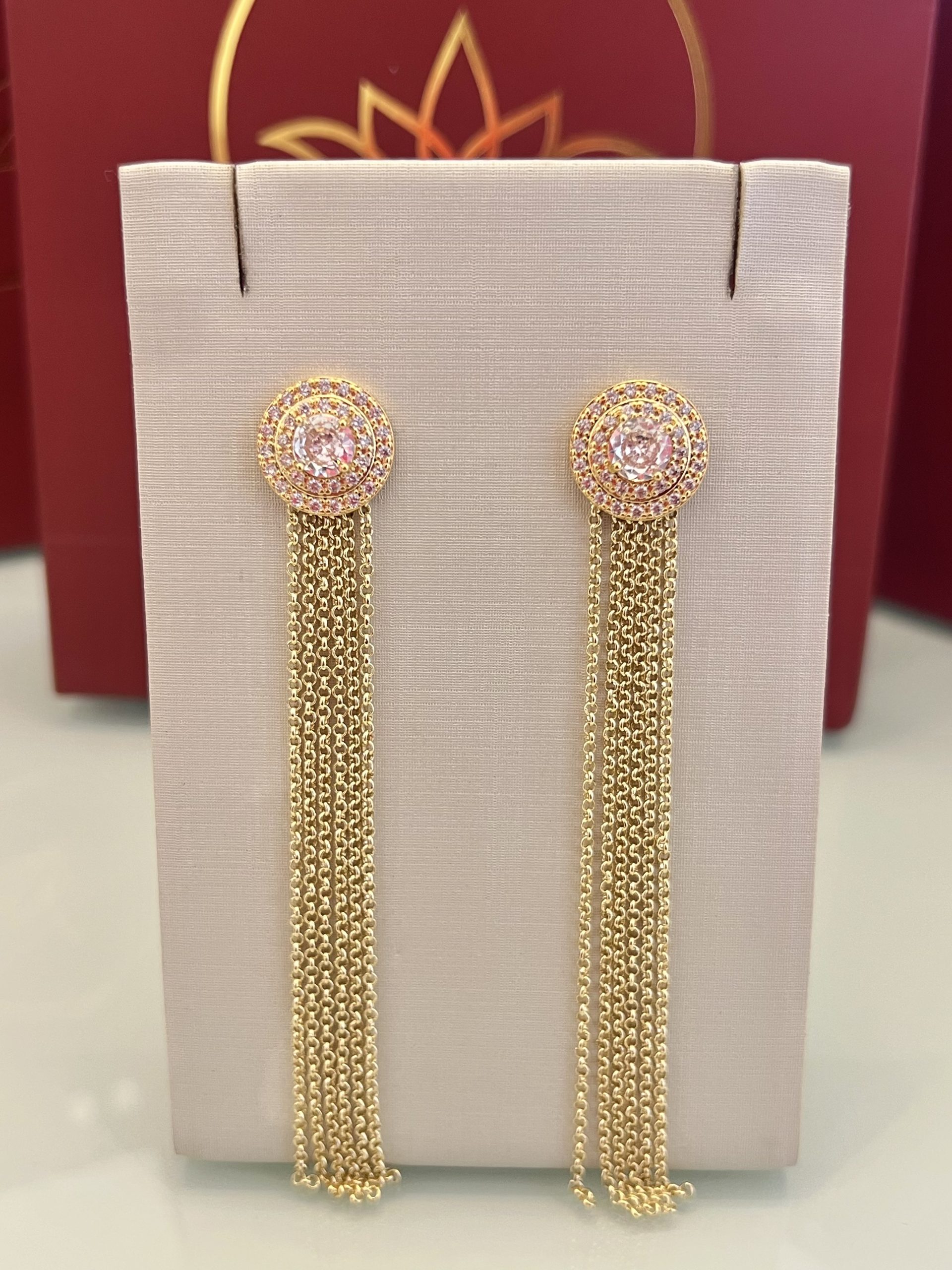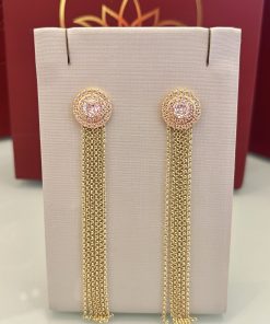 Brinco dourado com base redonda cravejada em zircônias cristal, formando um desenho luminoso e bem equilibrado. A peça acompanha franja de correntes douradas removível, permitindo duas formas de uso: apenas o redondo cravejado, para uma proposta mais discreta, ou com a franja, que traz movimento e presença ao visual. Um modelo prático, com acabamento delicado e brilho na medida certa.