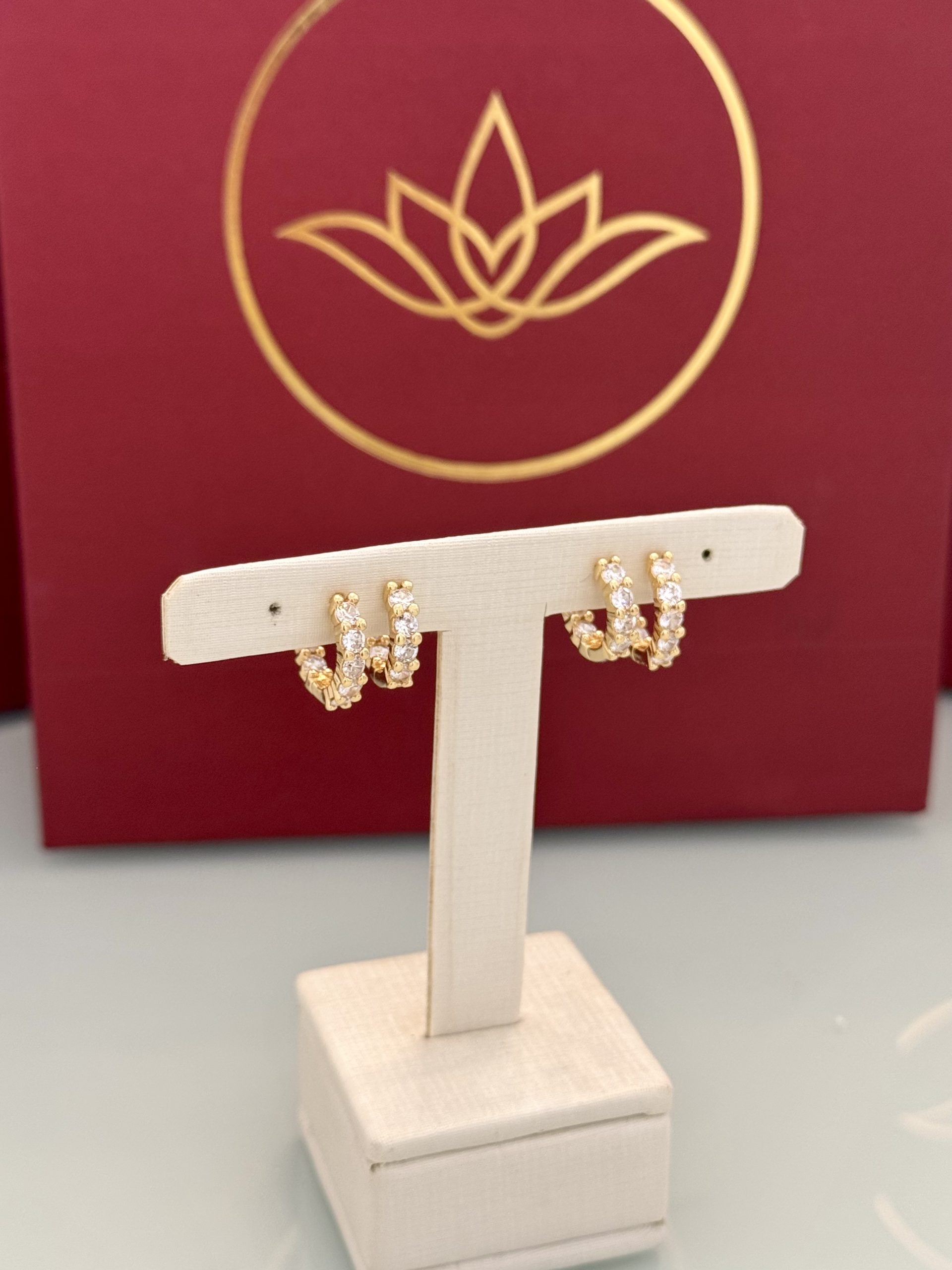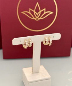 Brinco em banho dourado, modelo argola, com duplo cravejamento de zircônias, que garante brilho intenso e acabamento sofisticado. O design com duas fileiras de pedras valoriza a peça e cria um visual elegante e marcante, ideal para quem busca um acessório clássico com presença.