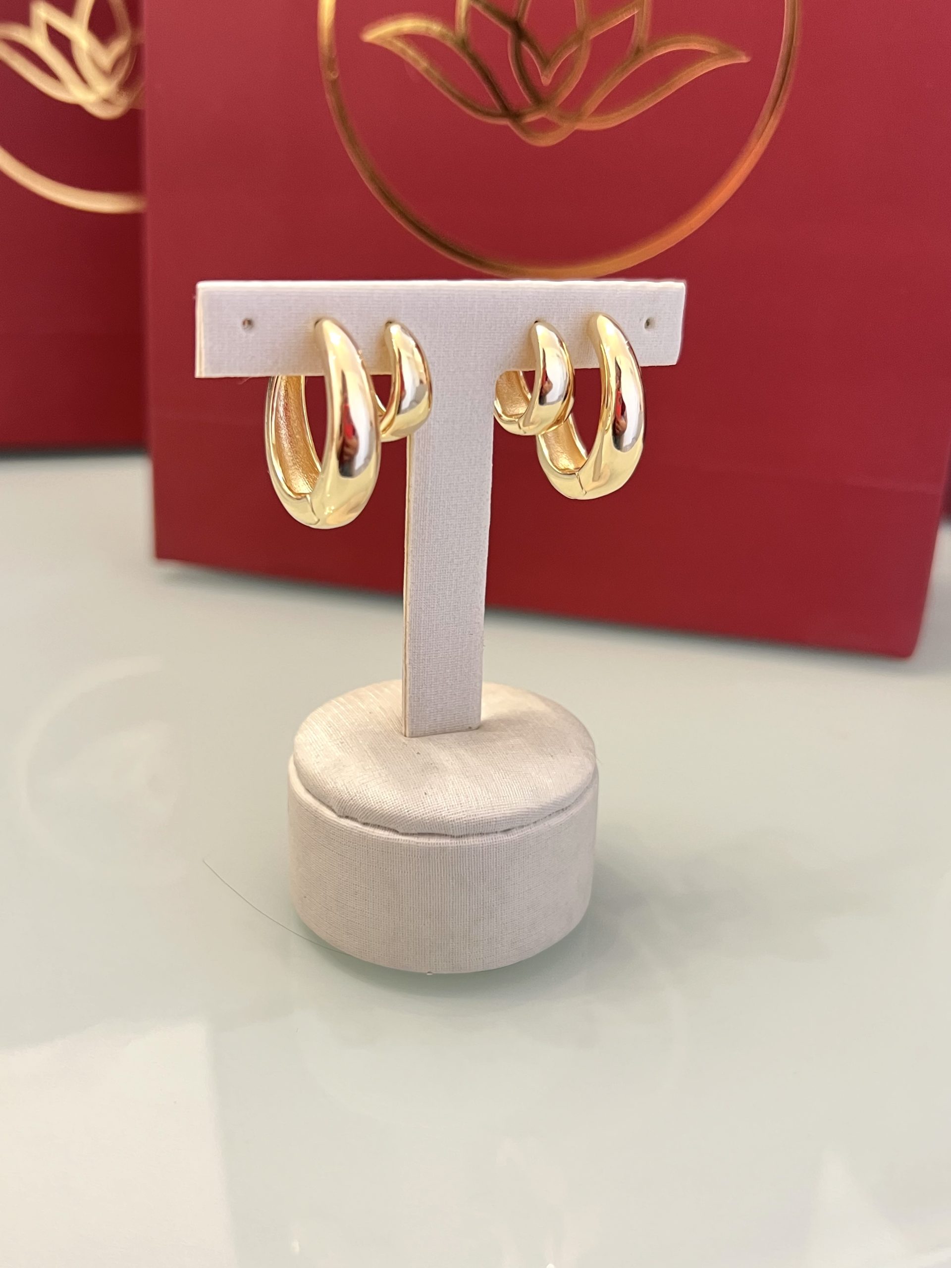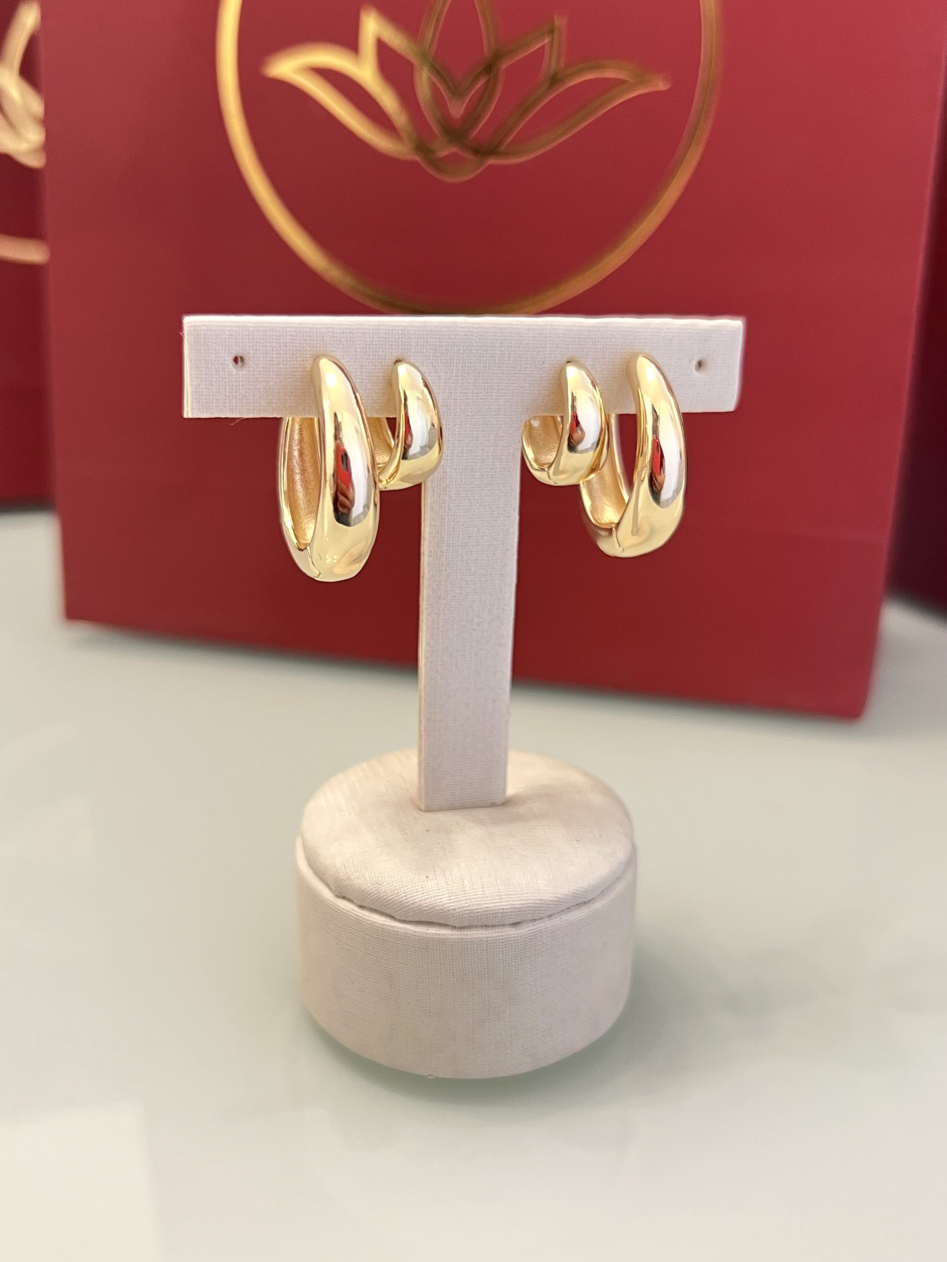 Brinco duo com duas argolas lisas, criando um visual moderno e equilibrado que valoriza o design limpo da peça. Um modelo atual, pensado para quem gosta de acessórios marcantes na medida certa, ideal para compor produções do dia a dia ou looks mais elaborados.