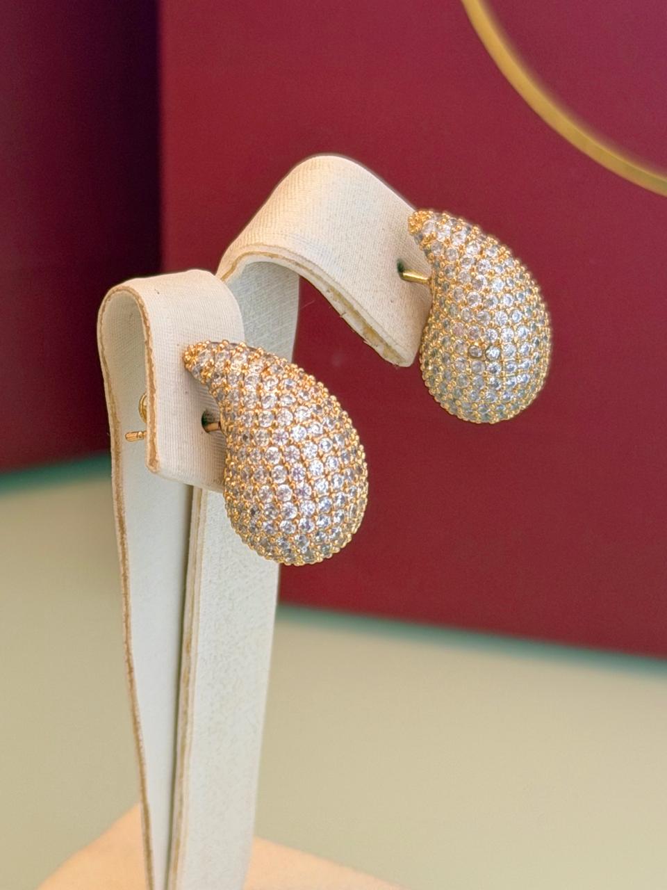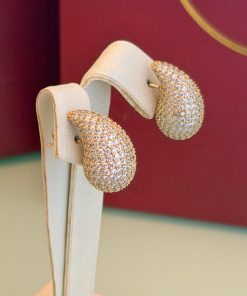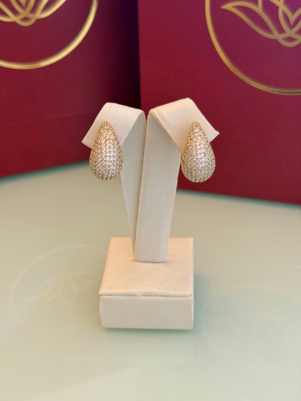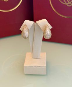 A gota em tamanho maior traz um brilho marcante, com cristais transparentes que refletem a luz de forma intensa. O banho dourado valoriza cada detalhe da peça, criando um visual glamouroso e cheio de presença. Perfeito para quem adora acessórios que se tornam o ponto de destaque da produção, seja no dia a dia ou em ocasiões especiais.
