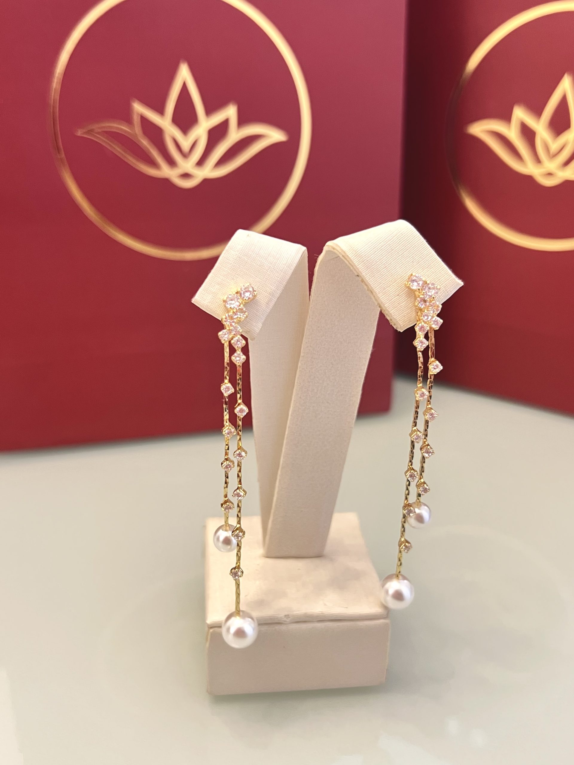 Brinco longo com pérolas que trazem delicadeza e movimento ao visual. O design alongado destaca a leveza da peça, perfeita para produções elegantes e femininas.