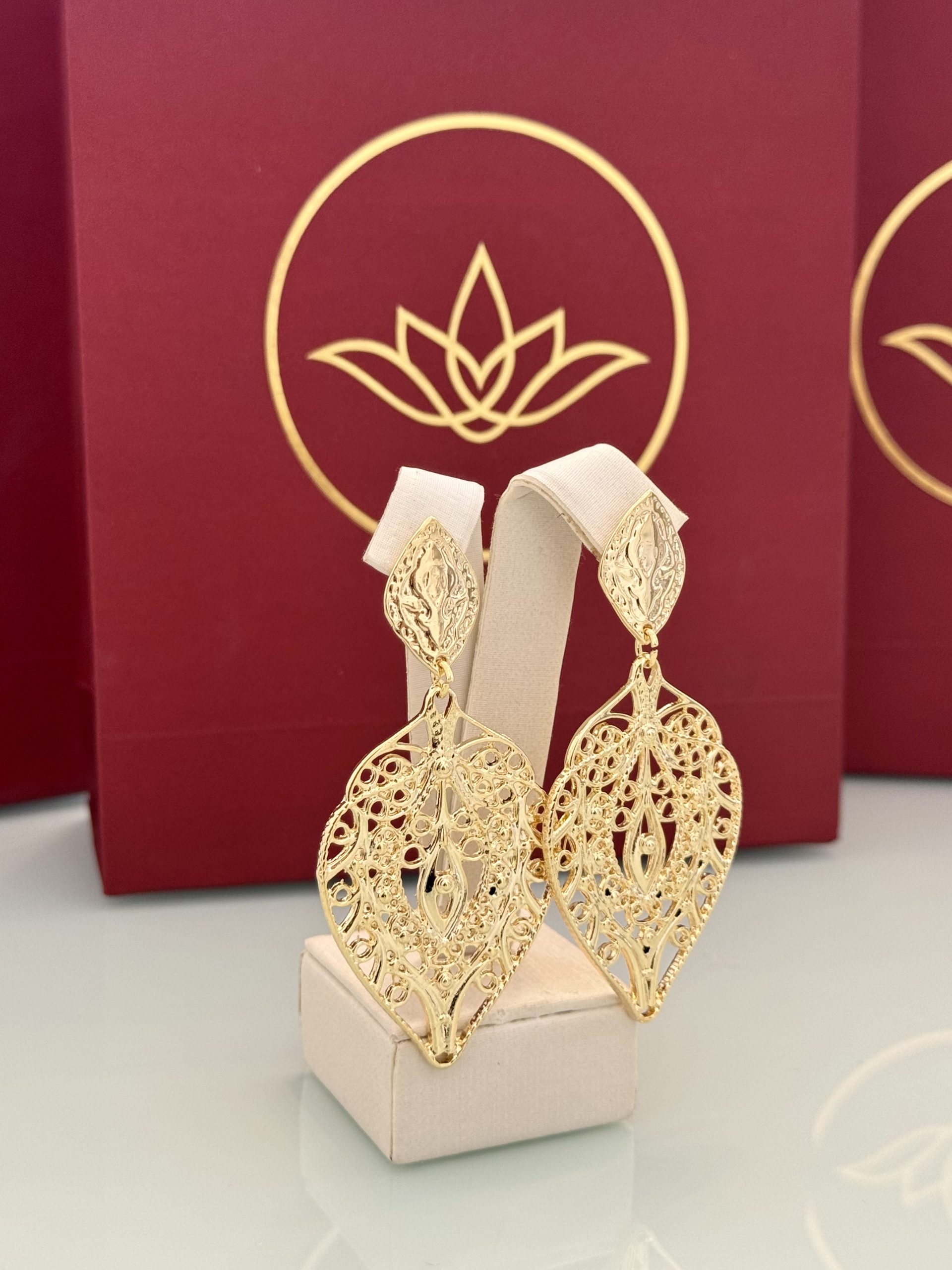 Brinco em banho dourado, com design pendente em formato de folha, trabalhado em vazados delicados que valorizam o brilho e os detalhes da peça. O topo em formato de folha menor conecta harmoniosamente ao pendente alongado, criando um visual elegante e marcante, ideal para quem busca um acessório com presença e acabamento refinado.