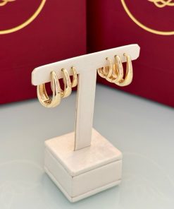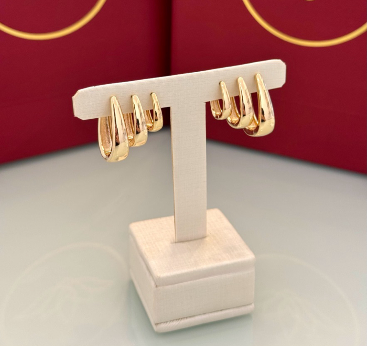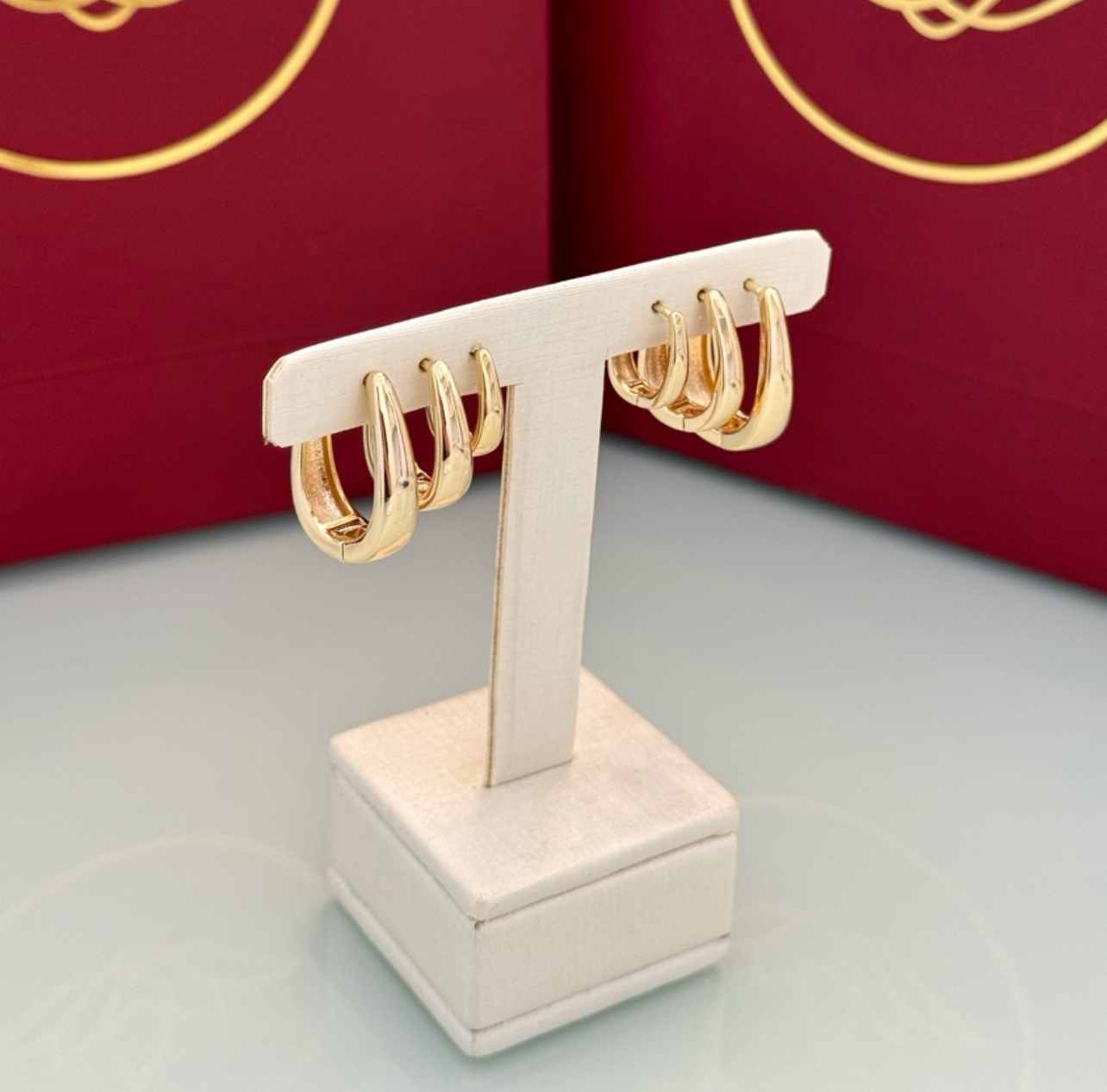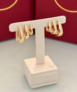 Trio de argolas ovais douradas em três tamanhos diferentes, ideal para criar composições versáteis no dia a dia. O formato oval traz um visual moderno e alongado, enquanto o acabamento liso garante leveza e fácil combinação com outros acessórios. Podem ser usadas juntas ou separadamente, permitindo diferentes propostas de uso com um design equilibrado e atual.