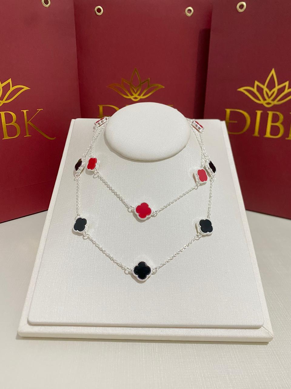 Chocker são delicadas e feitas com correntes douradas finas que destacam o brilho e a sofisticação das peças. Cada um apresenta pingentes em formato de trevo estilizado, com bordas douradas cuidadosamente trabalhadas, que envolvem um preenchimento esmaltado em cores vibrantes. As opções de cores dos pingentes incluem preto e rosa criando uma combinação harmoniosa e versátil. Os trevos têm um acabamento polido, destacando o contraste entre o dourado das bordas e o esmalte das cores centrais. O design transmite um equilíbrio perfeito entre delicadeza e modernidade, com as correntes caindo em camadas suaves que adicionam movimento e elegância. As peças são ideais para quem busca um acessório refinado, com um toque de cor que realça qualquer produção.