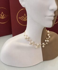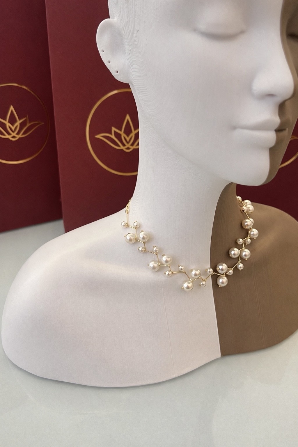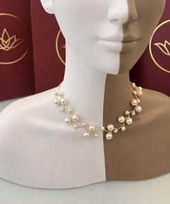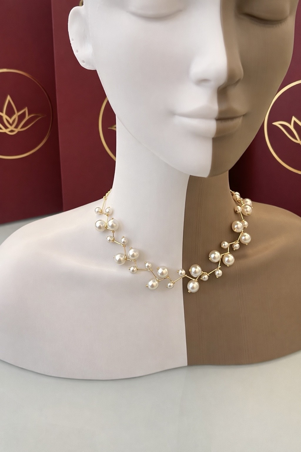 Choker dourada com pérolas delicadas distribuídas em uma composição orgânica, criando um visual leve e marcante no colo. O contraste do dourado com as pérolas brancas traz um acabamento elegante e atual, ideal para uso em ocasiões especiais 30CM + 9CM de extensor.
