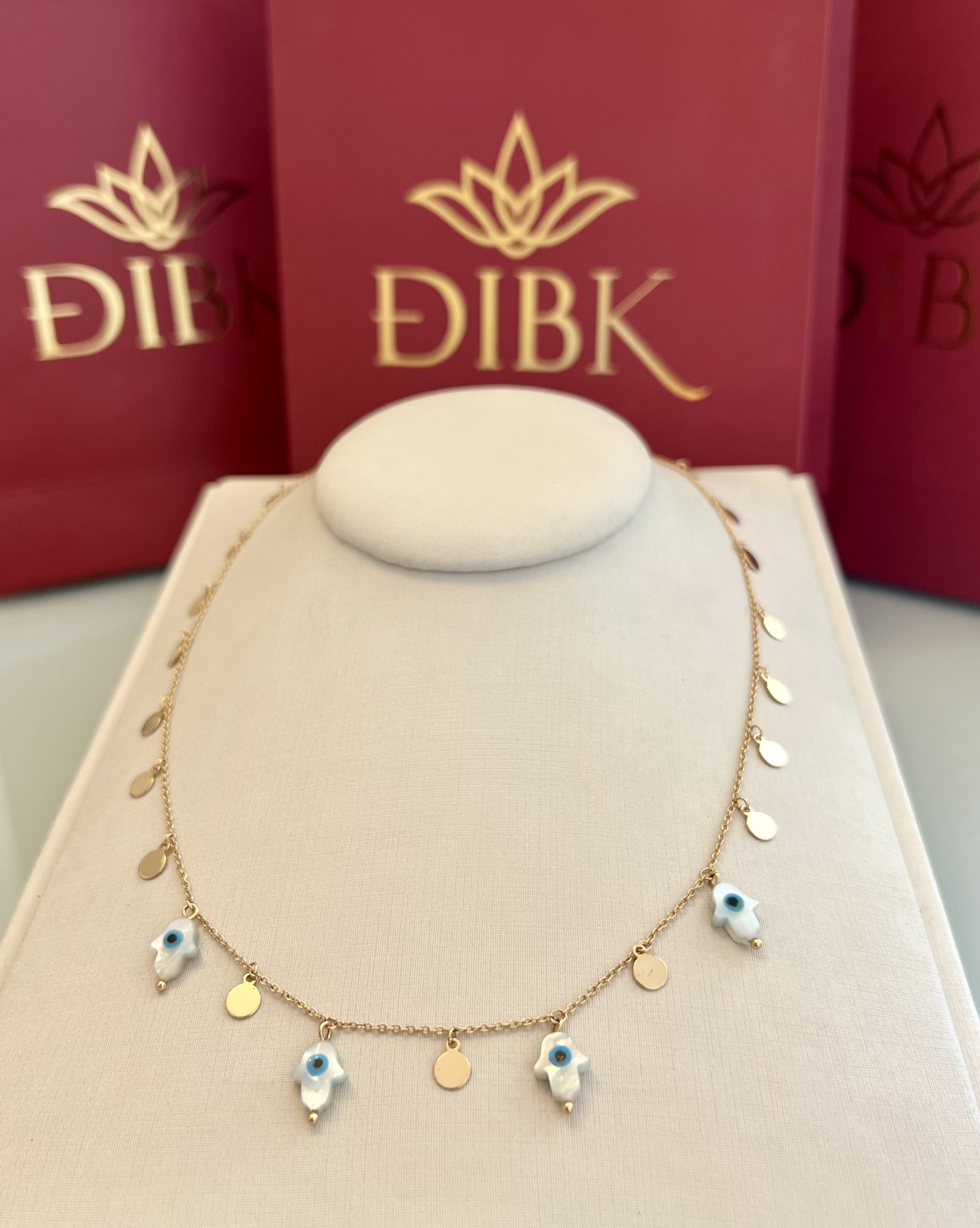 Esse colar é uma peça de proteção e boas energias, conhecido por carregar simbolismos fortes de culturas ancestrais. Ele é composto por uma corrente fina dourada com pequenos pingentes delicados em formato de discos lisos e brilhantes, intercalados com amuletos da Mão de Fátima (ou Hamsá) e Olho Grego. Os pingentes da Mão de Fátima são brancos, com um Olho Grego azul no centro, representando proteção contra o mau-olhado e energias negativas. A Mão de Fátima, também chamada Hamsá, é um símbolo que simboliza força, poder e sorte, sendo amplamente utilizado no Oriente Médio e em culturas árabes. O Olho Grego, presente nas mãos, é conhecido por afastar inveja e mau-olhado, atraindo boas vibrações e segurança espiritual. A combinação desses dois elementos torna esse colar uma poderosa peça de amuleto, além de ser uma joia moderna e elegante, perfeita para ser usada no dia a dia ou como um toque de proteção em ocasiões especiais. Esse acessório é ideal para quem busca se sentir protegido e atrair boas energias, enquanto exibe um visual delicado e estiloso.