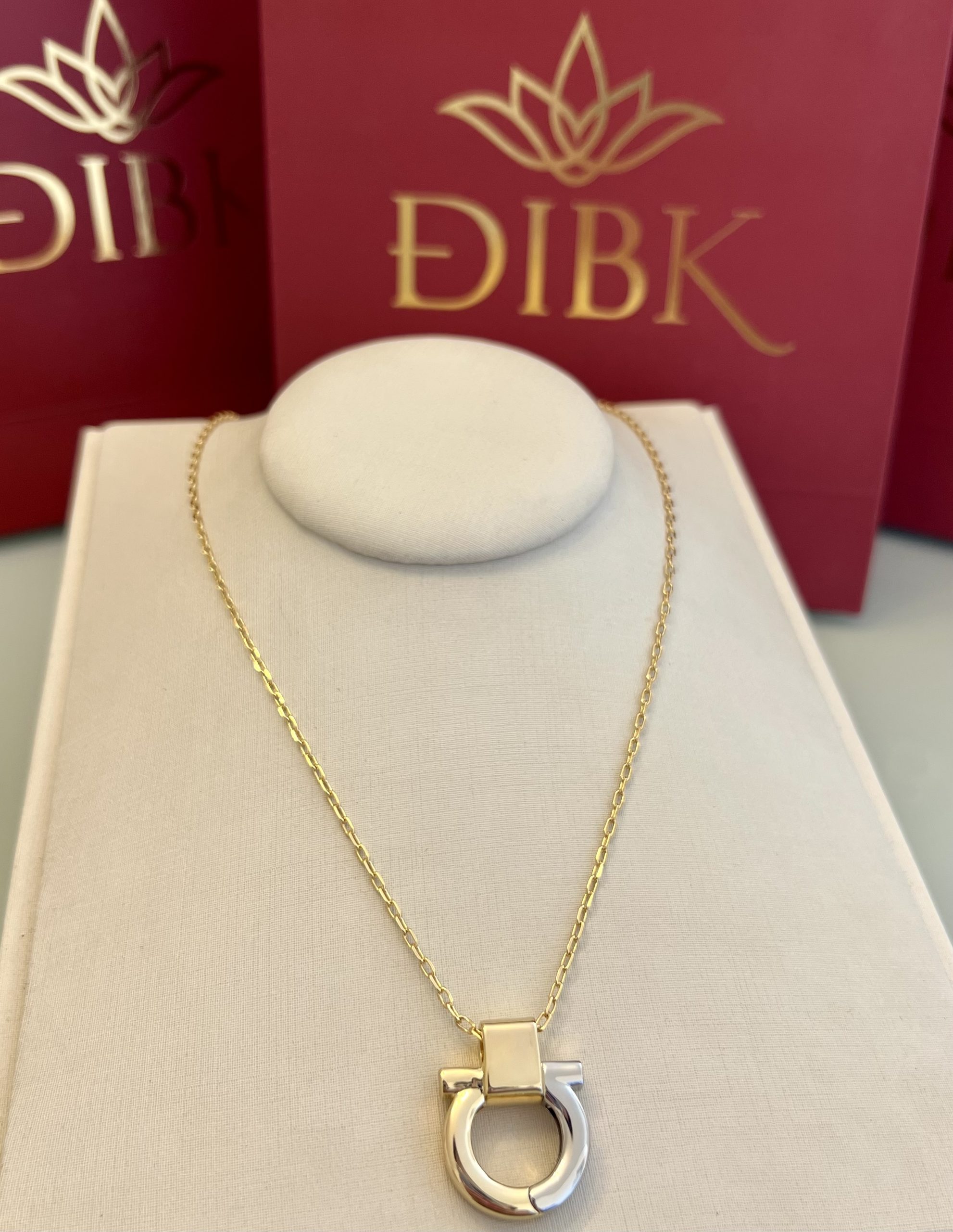Essa peça é um colar elegante e minimalista, composto por uma corrente fina dourada e um pingente moderno em formato de ferradura estilizada. O pingente combina dois tons metálicos – dourado e prateado –, criando um contraste sofisticado e versátil. O design da ferradura é um símbolo clássico de sorte e proteção, frequentemente associado a boas energias e afastamento de energias negativas. A união dos metais traz um toque contemporâneo, tornando a peça ideal tanto para o uso diário quanto para composições mais refinadas. Esse colar é uma escolha perfeita para quem busca um acessório discreto, mas carregado de significado e estilo.