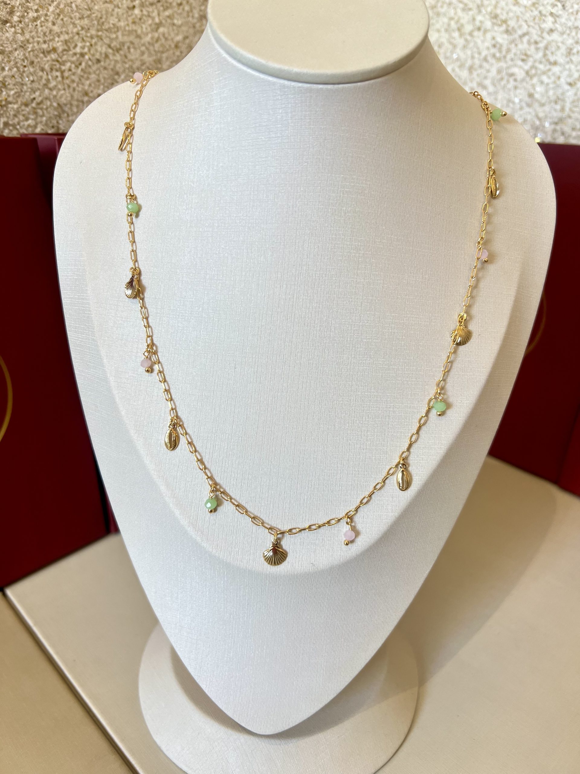 Colar longo com 79CM, composto por corrente em tom dourado com elos alongados e pingentes delicados ao longo da peça. O design traz conchas douradas intercaladas com búzios e pedras em tons de verde claro e rosa suave, criando um contraste leve e encantador. Uma peça marcante, que valoriza o colo e adiciona movimento ao visual. Ideal para usar sozinho ou em composições, trazendo um toque praiano e delicado à produção.