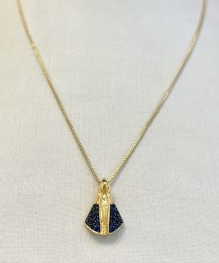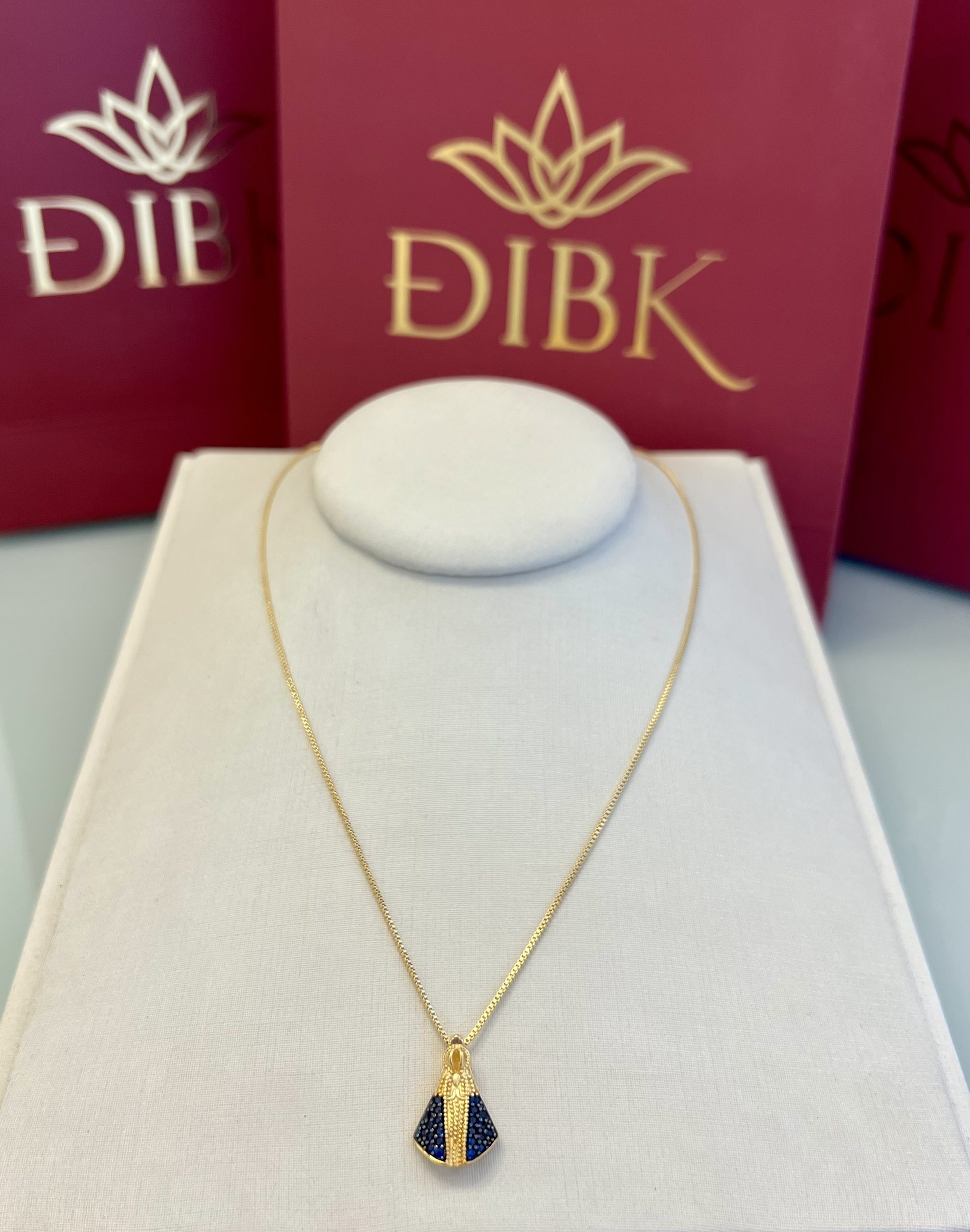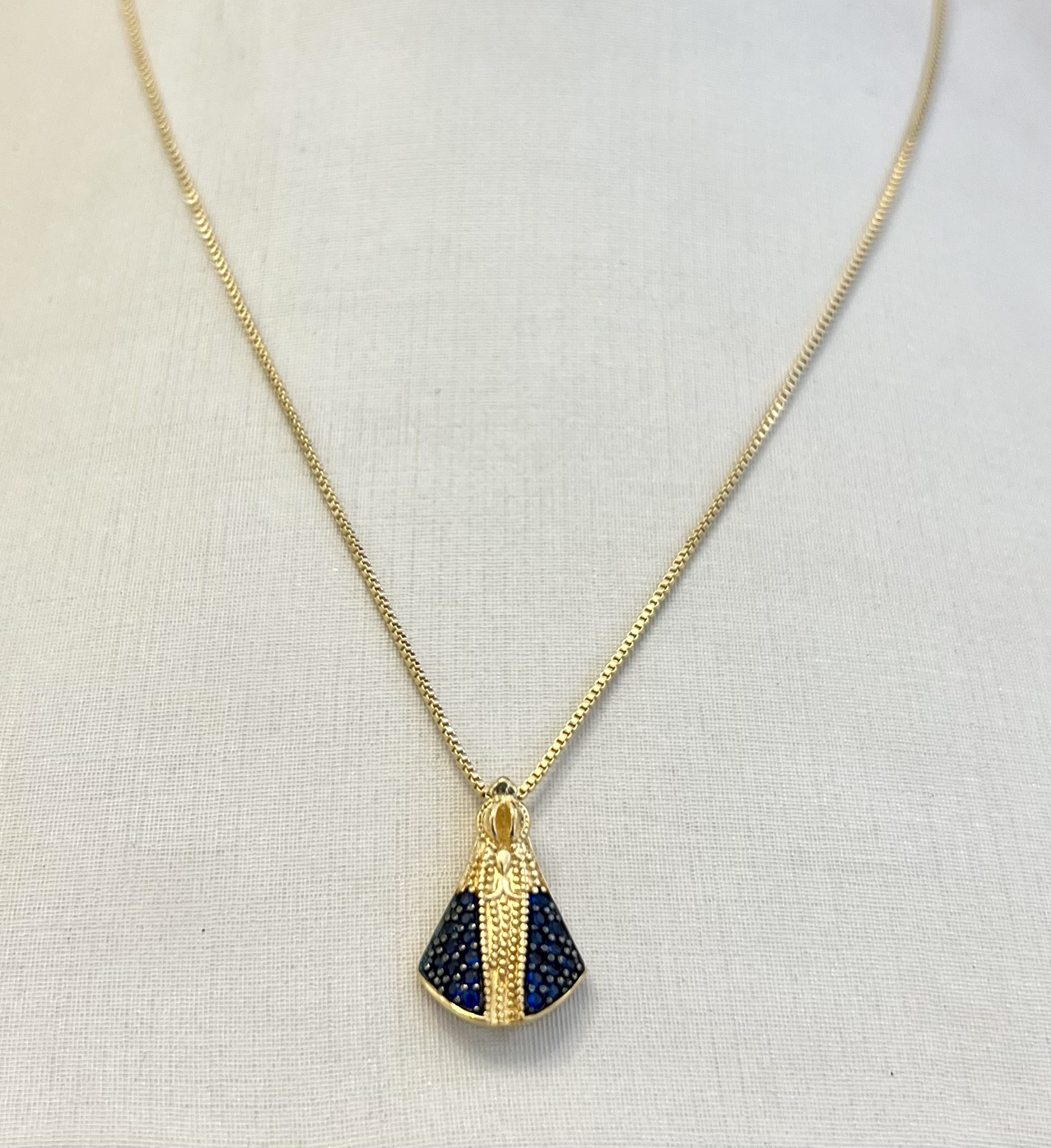 Essa peça é um colar delicado e sofisticado, composto por uma corrente fina dourada e um pingente em formato do manto de Nossa Senhora Aparecida, ricamente detalhado com pedras azuis e douradas. O design transmite um forte simbolismo de fé, devoção e proteção, sendo uma joia perfeita para aqueles que desejam carregar consigo a presença e a bênção da padroeira do Brasil. As pedras azuis trazem um toque de elegância e representam serenidade e espiritualidade, enquanto o dourado reforça a sofisticação da peça. Esse colar é uma escolha ideal tanto para o uso diário quanto para ocasiões especiais, proporcionando um toque de significado e beleza ao visual.