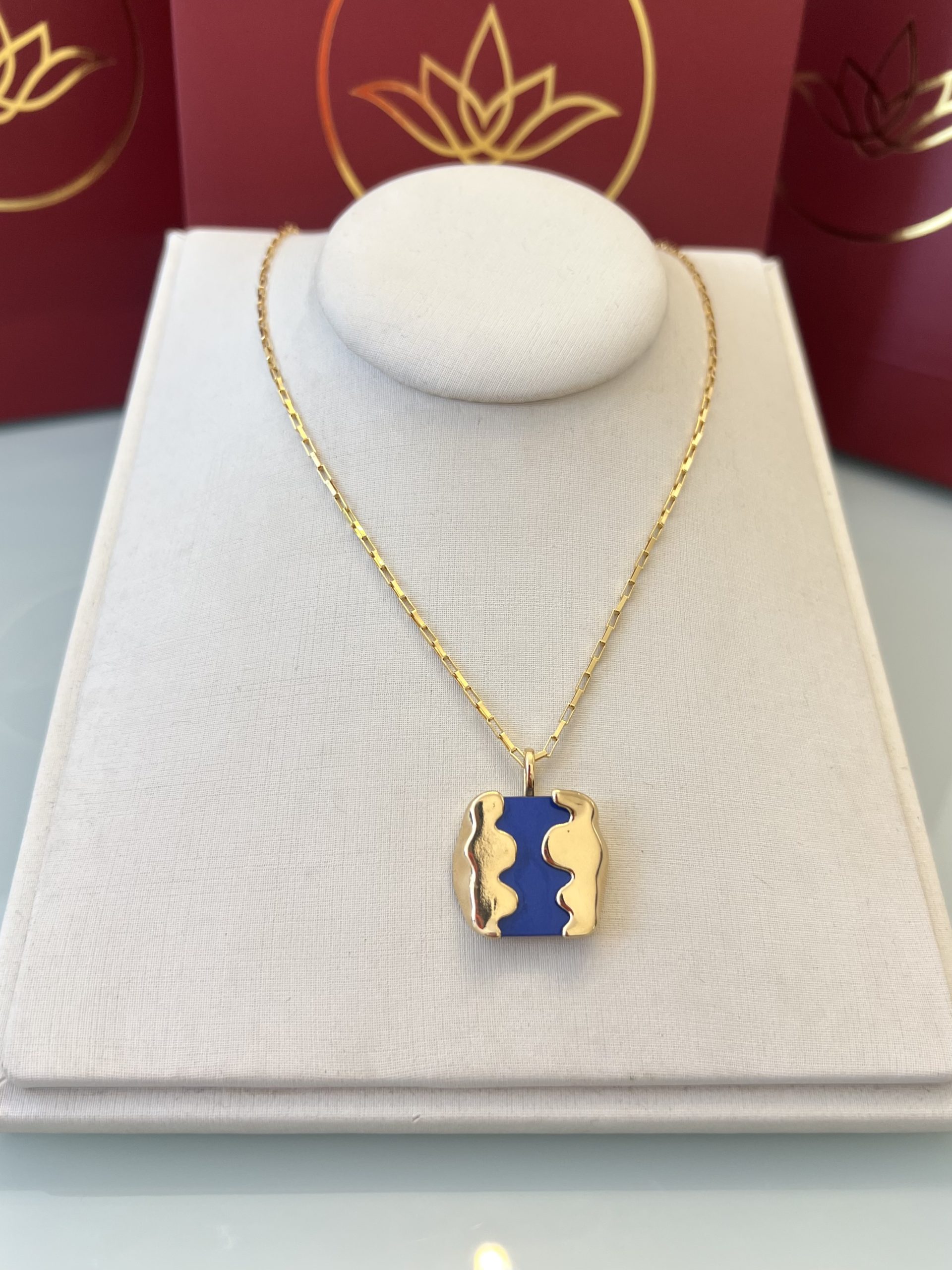 Colar com corrente dourada e pingente quadrado esmaltado em azul royal, com laterais onduladas em dourado polido que criam um contraste marcante e moderno. O design une base geométrica com traços orgânicos, trazendo personalidade e destaque na medida certa. Uma peça que ilumina o visual e adiciona cor com elegância, perfeita para usar sozinha ou combinada com outras correntes.