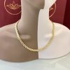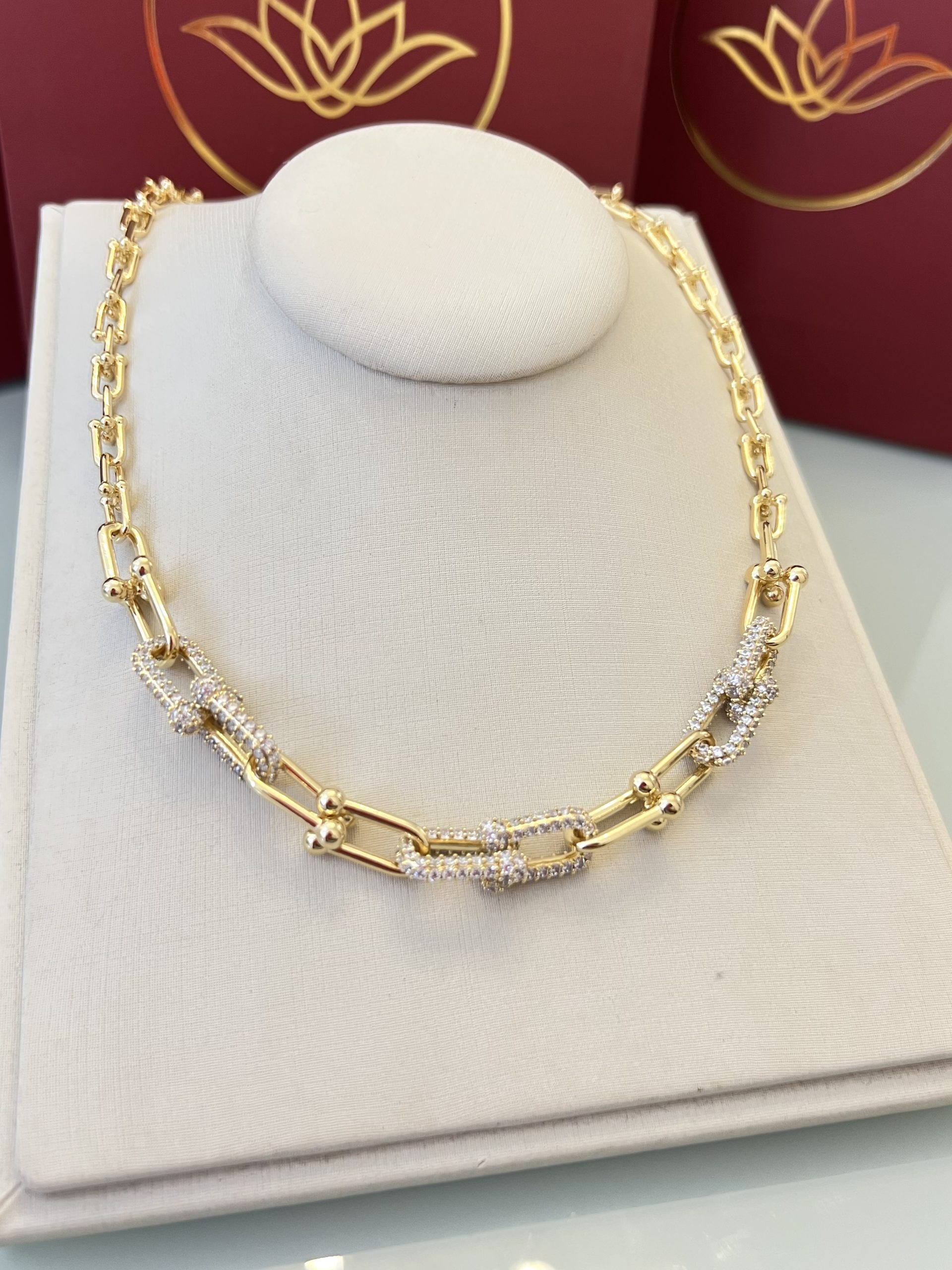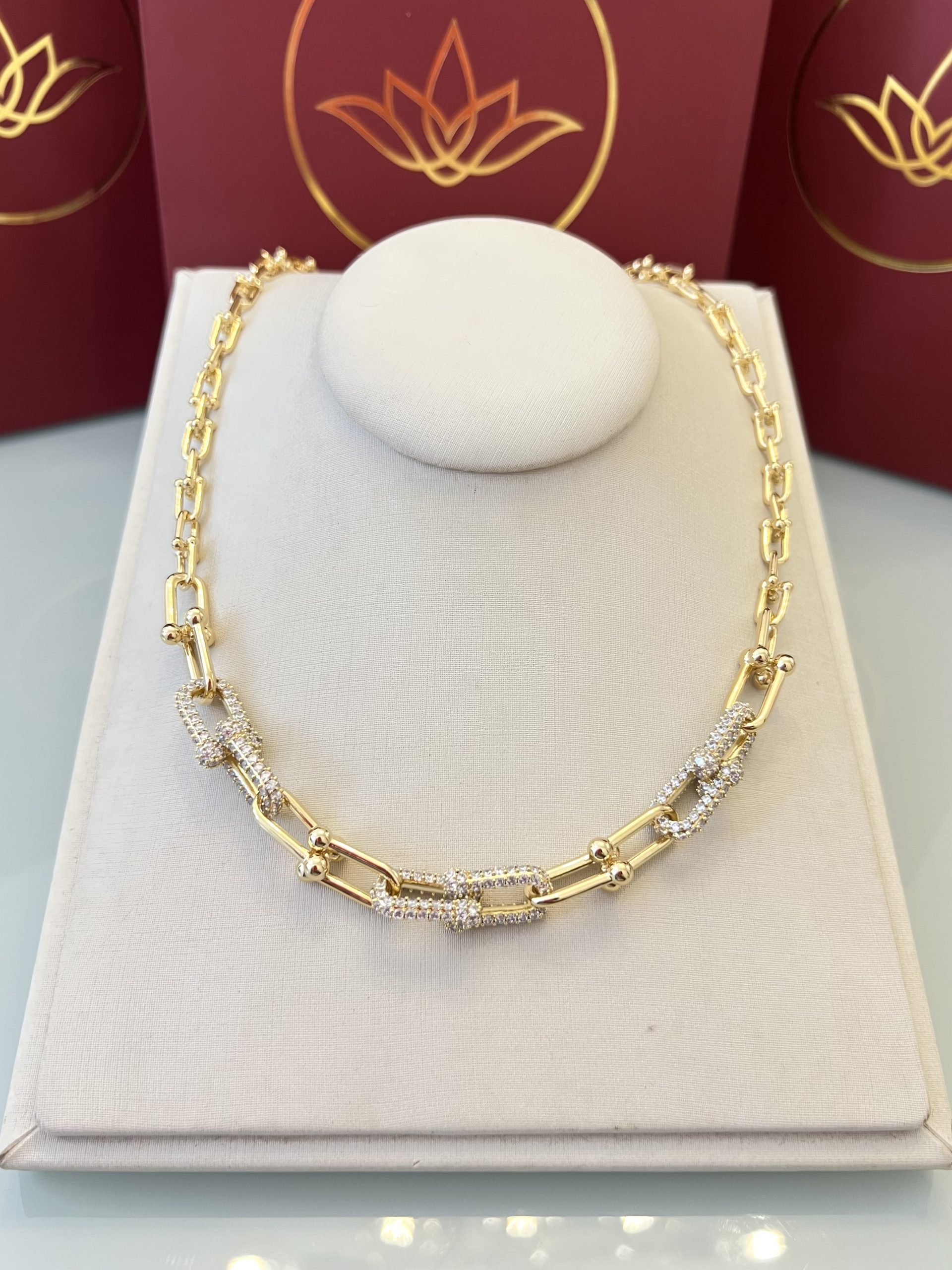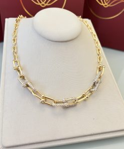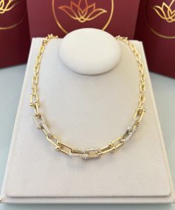 Colar Tiffany com formato cadeado, intercalando elos lisos na cor dourada com elos cravejados em zircônias brancas. O contraste entre o brilho intenso do dourado e o brilho delicado das pedras brancas cria um efeito marcante e cheio de presença no colo. Uma peça imponente, com design moderno e acabamento detalhado, perfeita para ser o destaque da produção ou para composições com outros colares.