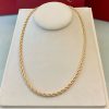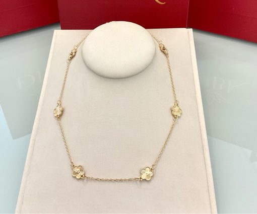 Este é um colar longo inspirado no estilo Van Cleef & Arpels, com um design elegante e atemporal. Dourado, a peça possui uma corrente delicada de 40 cm de comprimento, com 5 cm de extensão, proporcionando versatilidade no ajuste. O colar é adornado com elementos em formato de trevo, um símbolo de sorte e sofisticação, distribuídos harmonicamente ao longo da corrente. O acabamento refinado e os detalhes minuciosos tornam essa peça um acessório luxuoso, ideal para quem busca um toque de exclusividade e requinte no visual.