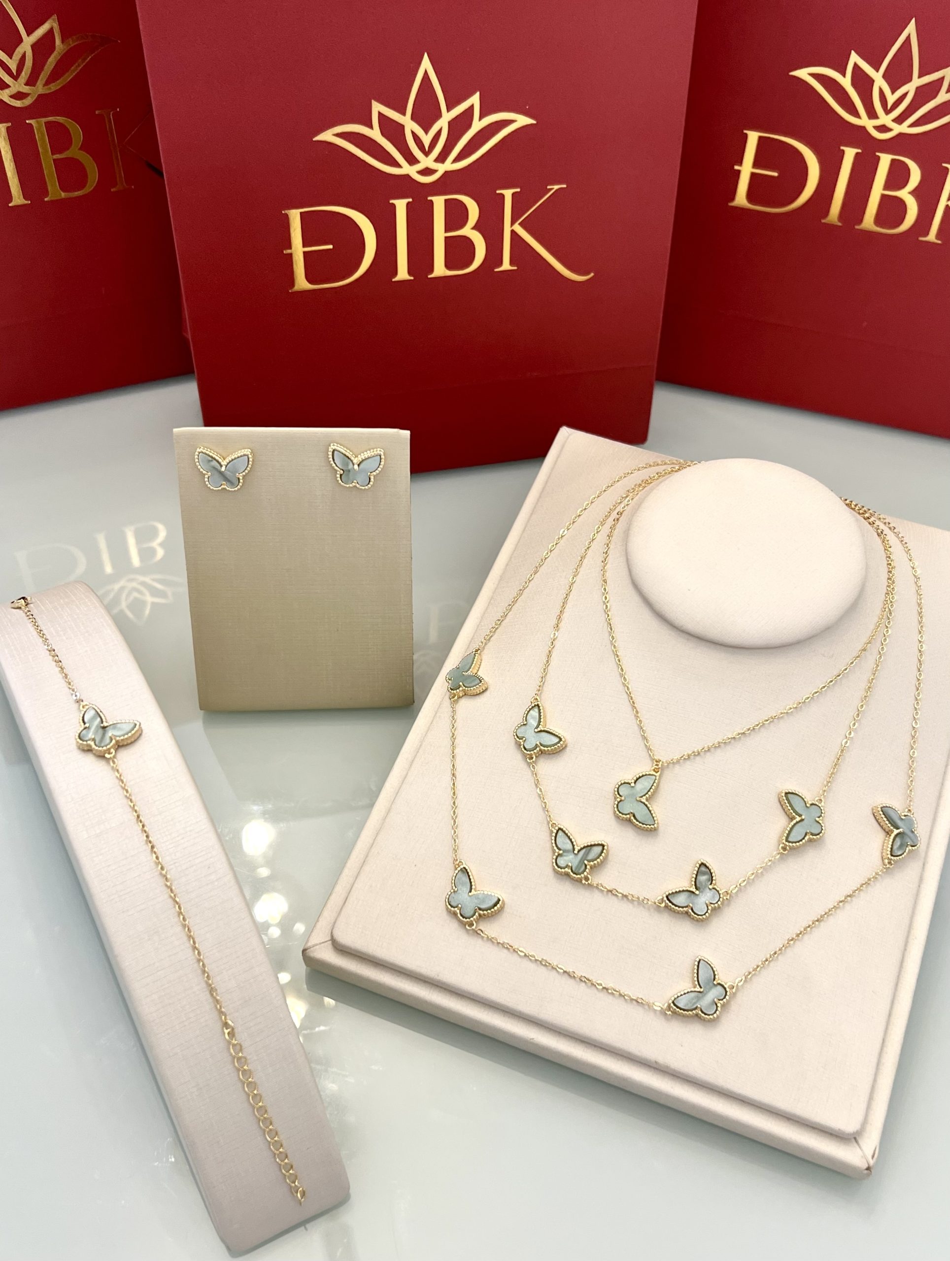Conjunto banhado a ouro com colar em diferentes tamanhos, pulseira e brincos, todos adornados com delicadas borboletas em tom verde-água perolado. Um toque de leveza e feminilidade para compor looks elegantes e românticos.