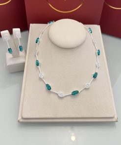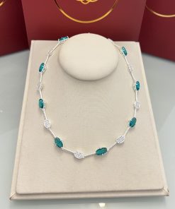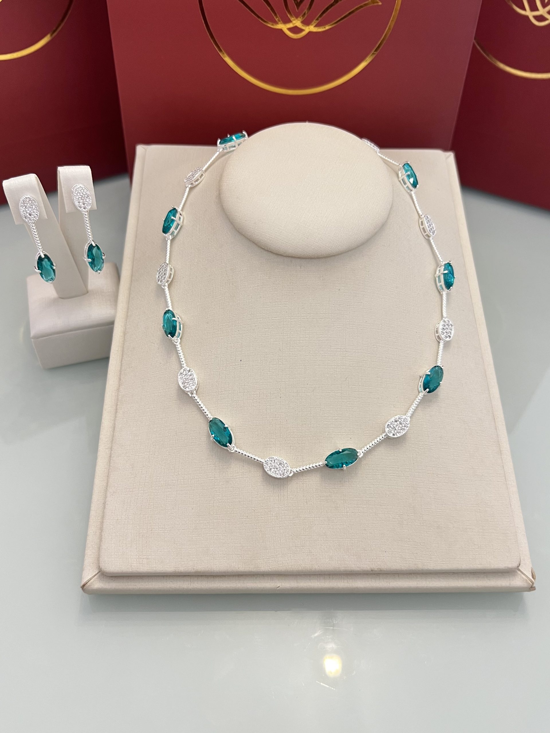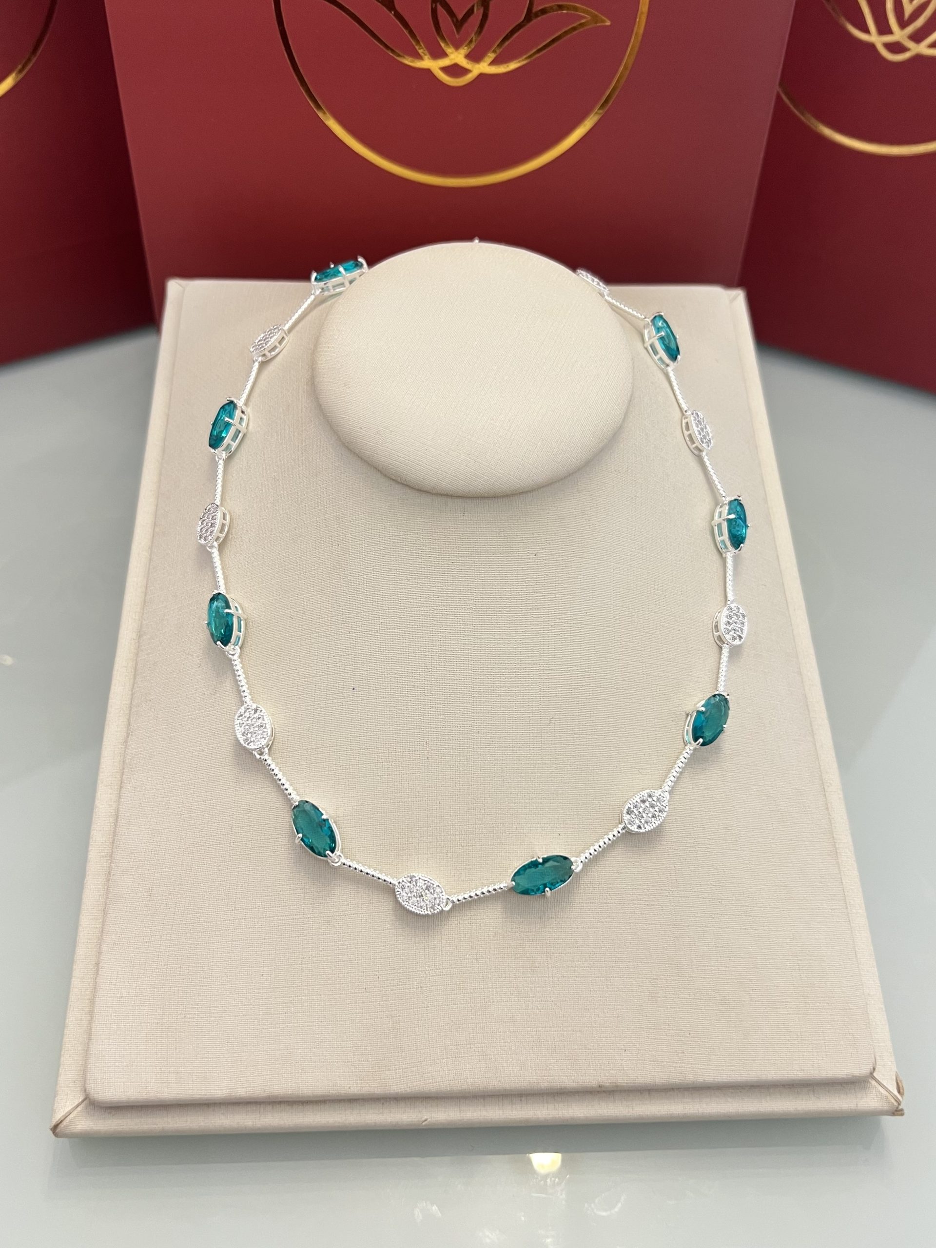 Colar em tom prateado com design delicado, composto por pedras ovais na cor verde intensa intercaladas com pontos circulares cravejados em cristal branco, criando um contraste elegante e cheio de brilho. Uma peça que se destaca pelos detalhes e pela combinação harmoniosa das cores. Possui comprimento de 40CM + 8,5CM de extensor.