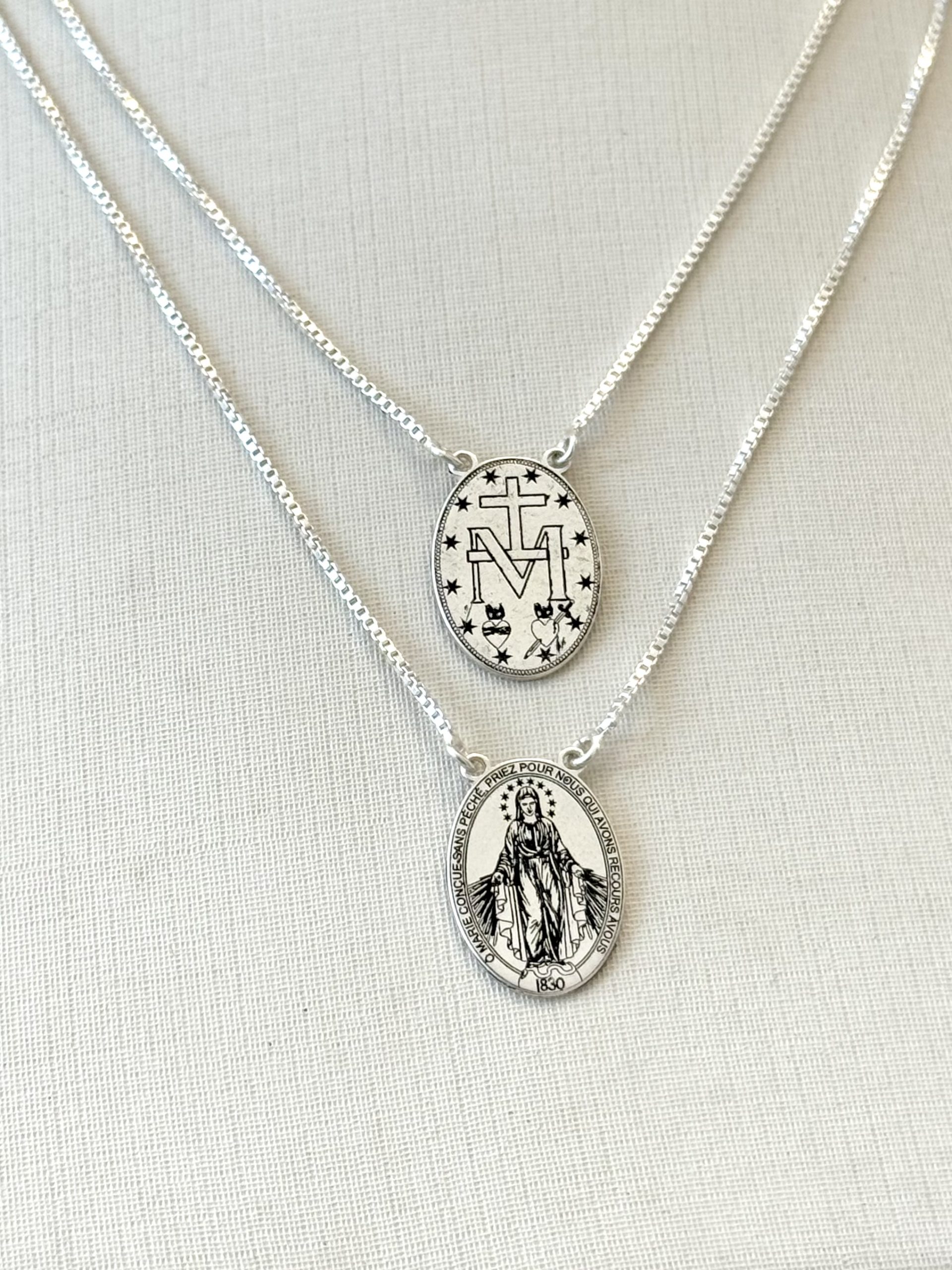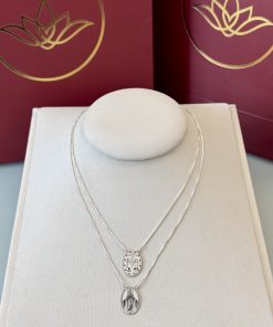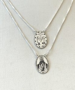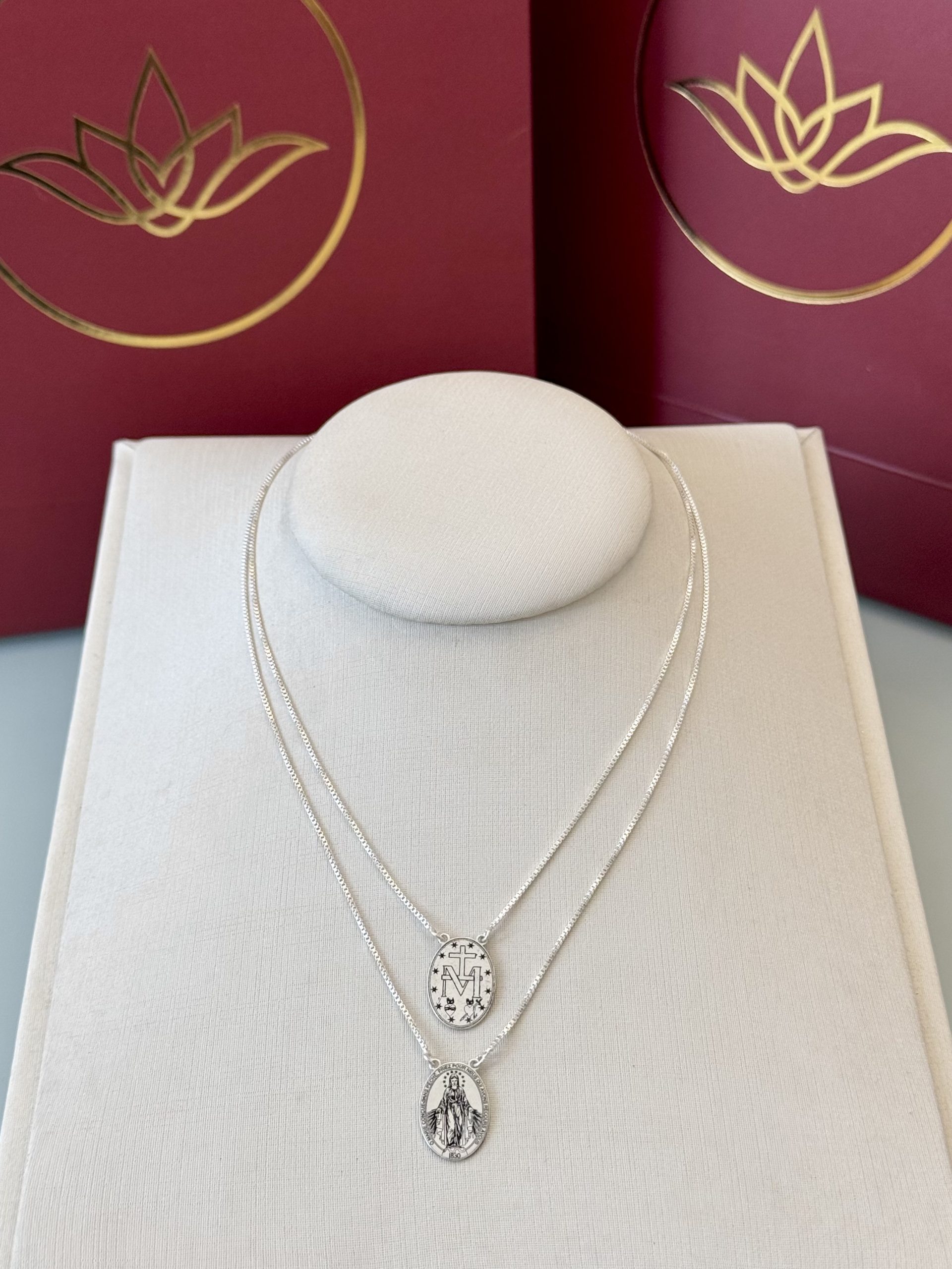 Escapulário de Nossa Senhora das Graças em Prata 925, com medalhas ovais ricamente detalhadas. Símbolo de fé, proteção e devoção mariana, ideal para uso diário com delicadeza e espiritualidade.