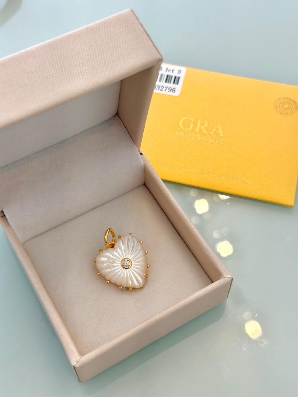 Pingente mandala com fundo perolado, confeccionado em moissanite, pedra reconhecida pelo brilho intenso e pela durabilidade superior. O design traz acabamento em linhas suaves que formam a mandala, criando um efeito luminoso e delicado. No centro, a moissanite transparente ganha destaque, enquanto a borda com pequenos detalhes em relevo valoriza o contorno da peça. O banho dourado harmoniza com o tom claro do fundo, garantindo um visual elegante e bem definido. Uma joia marcante, com presença e acabamento refinado, ideal para quem busca um pingente diferenciado e atemporal.