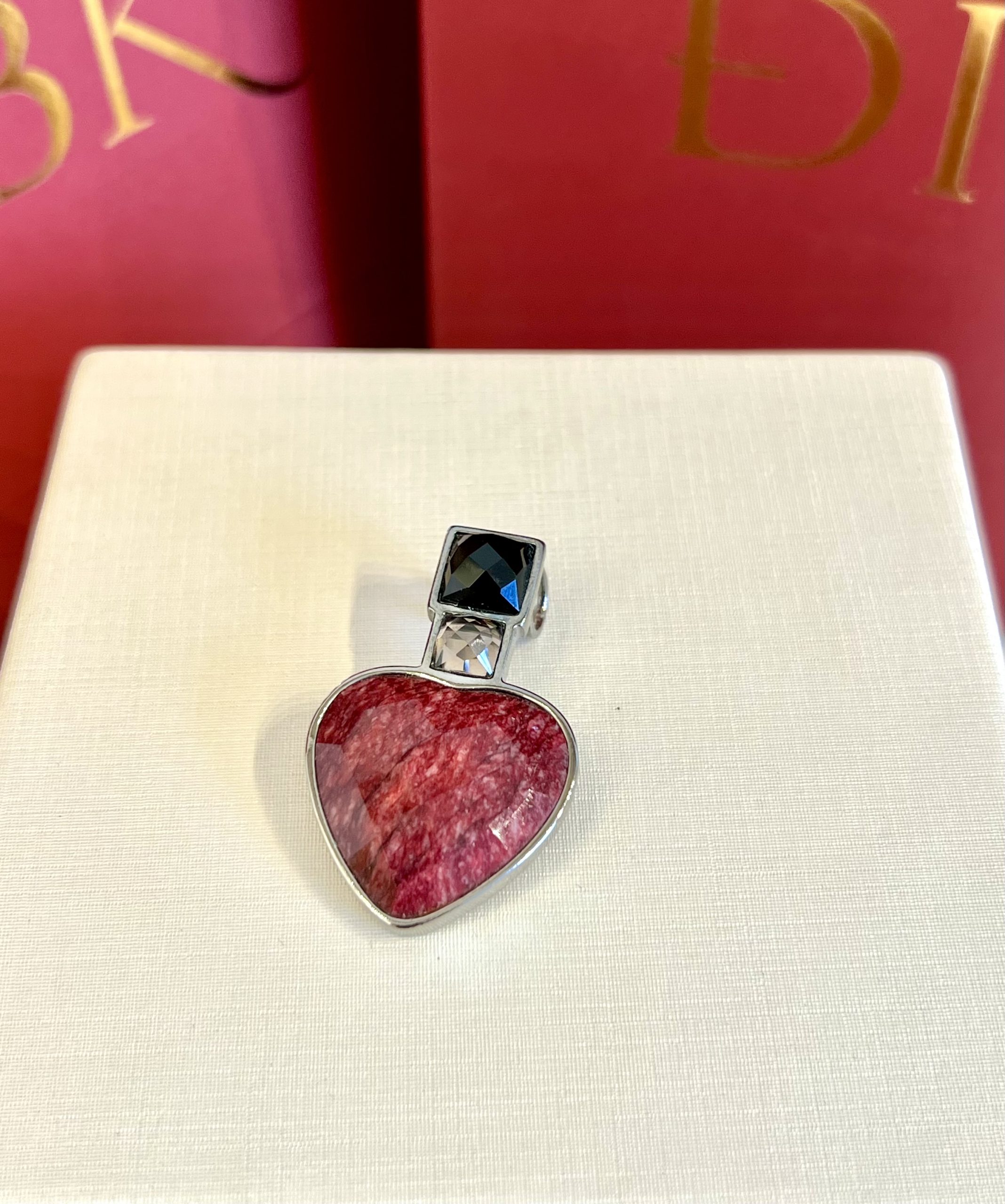 Pingente em ródio com design sofisticado, destacando um coração em pedra natural avermelhada, com veios sutis que adicionam profundidade à peça. O topo é composto por duas pedras facetadas: uma quadrada preta, que confere um toque elegante e moderno, e uma transparente, que suaviza a composição com delicadeza. A moldura em ródio realça o brilho das pedras, tornando este pingente uma peça única e cheia de charme.