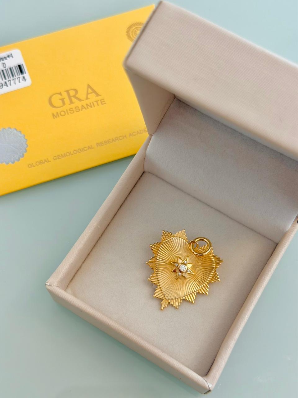 Mandala com coração central, confeccionada em moissanite, pedra reconhecida pelo brilho intenso e pela alta durabilidade. O design traz o coração como ponto de destaque, envolvido por uma composição harmoniosa que valoriza o formato da mandala. As moissanites transparentes refletem a luz de forma uniforme, criando um efeito luminoso e bem distribuído. Uma joia com presença, acabamento preciso e visual marcante, ideal para quem busca um pingente delicado com identidade forte.