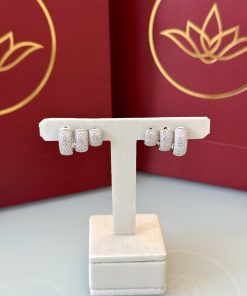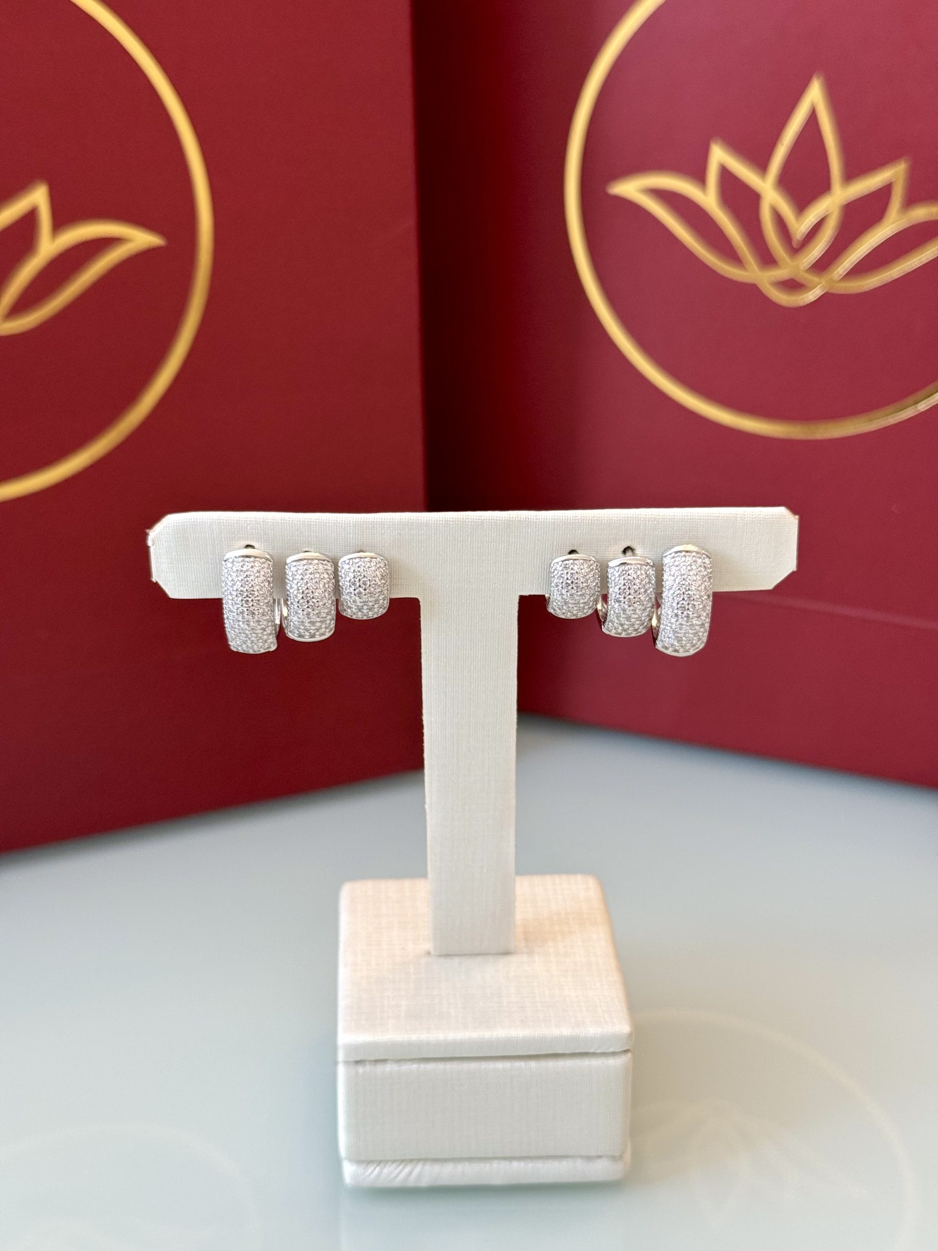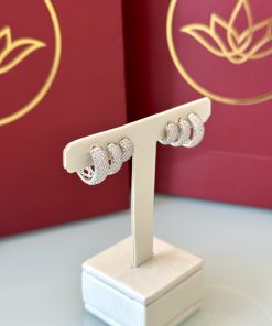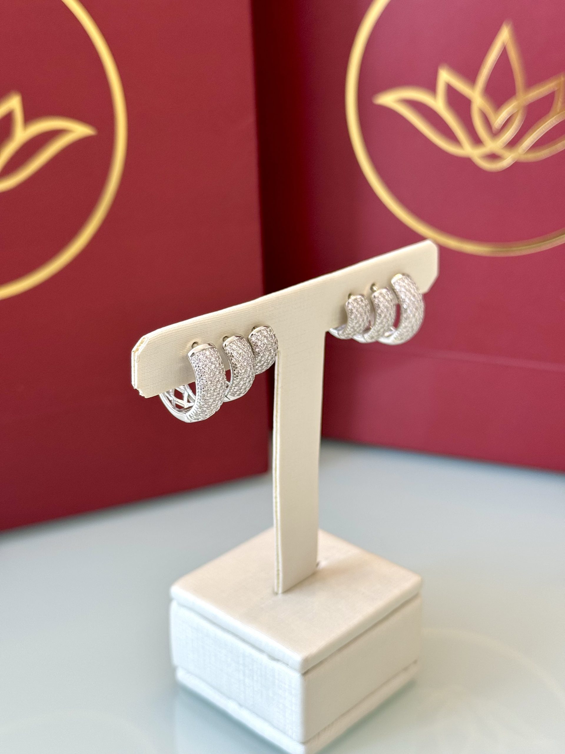 Trio de argolas redondas cravejadas sendo no banho de ródio, com brilho intenso e acabamento refinado. As três argolas em tamanhos diferentes permitem combinações versáteis, ideais para quem ama praticidade e estilo.